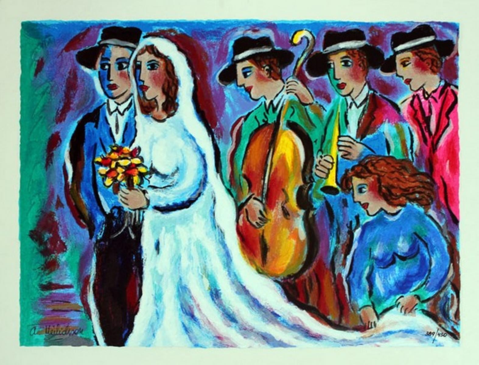 Artist: Alex Meilichson - Title: Wedding Vows - Medium: Serigraph on Fine Art Paper - Signature: Hand-signed by the Artist - Limited Edition: 450 - Image Size: 9 inches x 12 inches - Paper Size: Approximately 10.5 inches x 13.5 inches - Unframed - Details: This work comes with a Certificate of Authenticity - Alex Meilichson has developed a figurative style, using a palette of brilliant colors. His favorite media are ink, acrylic and oil on canvas. He paints Judaic themes, landscapes and still life in an expressionist 'Ecole de Paris' approach. -