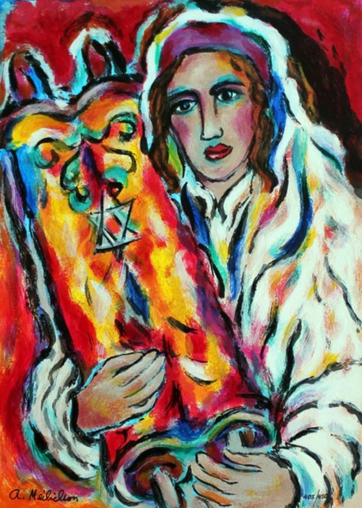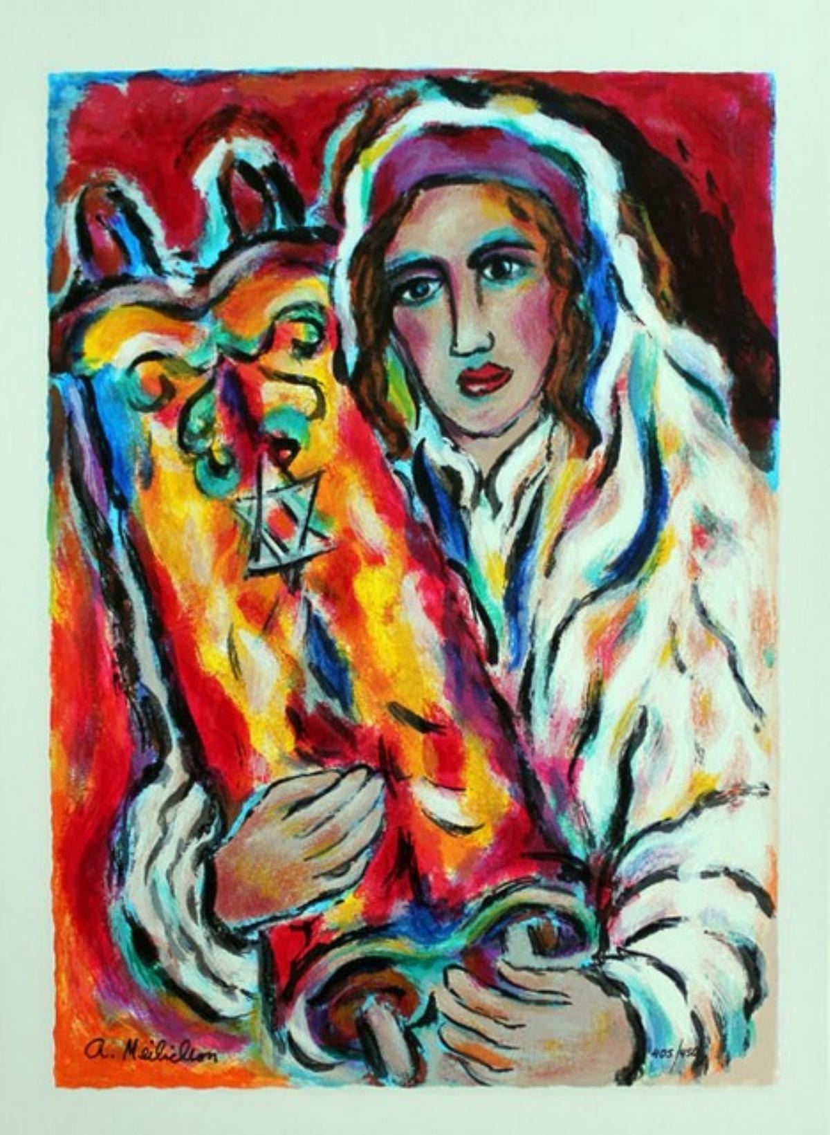 Artist: Alex Meilichson - Title: Yeshiva Bucher - Medium: Serigraph on Fine Art Paper - Signature: Hand-signed by the Artist - Limited Edition: 450 - Image Size: 12 inches x 9 inches - Paper Size: Approximately 13.5 inches x 10.5 inches - Unframed - Details: This work comes with a Certificate of Authenticity - Alex Meilichson has developed a figurative style, using a palette of brilliant colors. His favorite media are ink, acrylic and oil on canvas. He paints Judaic themes, landscapes and still life in an expressionist 'Ecole de Paris' approach. -