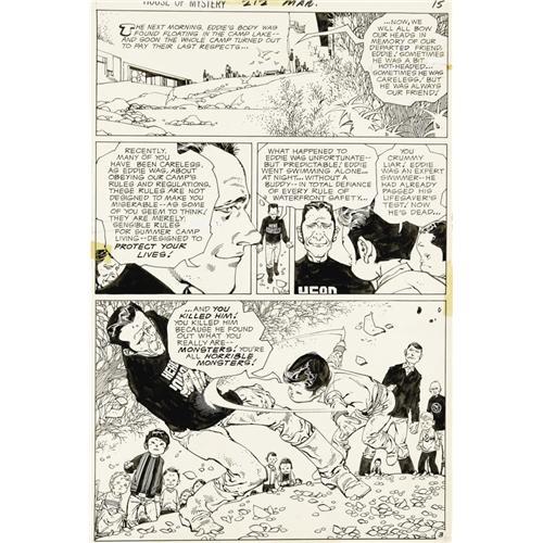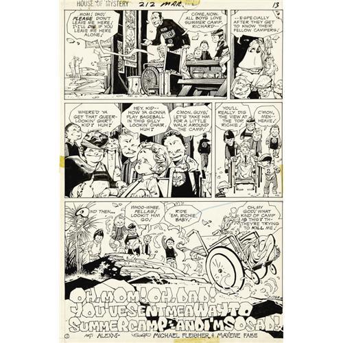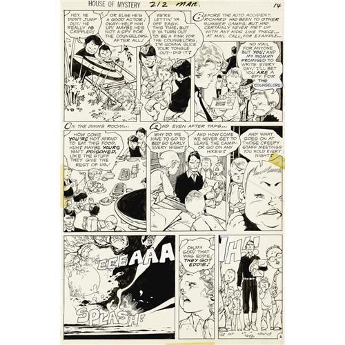 <B>Alex Nino - House of Mystery #212, Complete 8-page Story "Oh, Mom! Oh, Dad! You've Sent Me Away to Summer Camp... and I'm So Sad!" Original Art (DC, 1973).</B></I> They're not camp counselors, they're aliens from outer space, and Rich and the other kids are just the first step in their plan to conquer Earth! Written by Michael Fleisher, this weird, wild tale was illustrated by the unimitable Alex Nino. Each page has an image area of 10" x 15". There is some light tanning to the paper, some blue editorial markings, and tape stains on all four edges of each page; otherwise the pages are in Very Good condition. <BR><BR><B>Important notice:</B> Heritage usually auctions material at the rate of 200-250 lots per hour. On some occasions eBay Live bid software or the Internet may not be able to keep up with the pace of the auction. We recommend placing a realistic absentee bid now as insurance to avoid disappointment. Occasionally the auctioneer may eliminate or reject an eBay Live bid, and the auctioneer may also reopen a lot after the close of the eBay live bidding (usually because we missed an audience bid), and may reject your bid even if it shows you as the winning bidder. By bidding via eBay Live, you agree that Heritage may award the lot to another bidder at its sole discretion under the circumstances described above or any other reasonable circumstances. Since eBay bids are not shown to us until we open the lot on the floor, we treat those bids just like floor bids. In most cases the floor responds before the eBay bid is presented to us, due to Internet lag time, so for consistency we have made it a policy that floor bids are always considered first over tie eBay live bids. Also please note that all Heritage lots purchased through eBay Live carry a 22.5% Buyer's Premium. Please make sure you read the Terms and Conditions before you bid. This lot is being auctioned in conjunction with a live floor auction by Heritage Auction Galleries. All final auction and invoice information will be supplied by Heritage Auction Galleries, and all other information should be considered preliminary. Lot:41001 <BR><BR><B>Winning Notification and Billing:</B> After the FINAL session in this auction is complete, Heritage will send e-mail and snail mail invoices. This process normally takes several days. All final auction and invoice information will be supplied by Heritage Auction Galleries, and all other information should be considered preliminary. <BR><BR>This auction will be conducted on a live auction floor and over the Internet through eBay Live. If you choose to place an absentee bid, please take a moment to <font color='#0000ff'><u><a href='http://pages.ebay.com/liveauctions/help/before/laabsentee.html'>learn how eBay Live absentee bidding works</a></u></font><font color='#000000'>