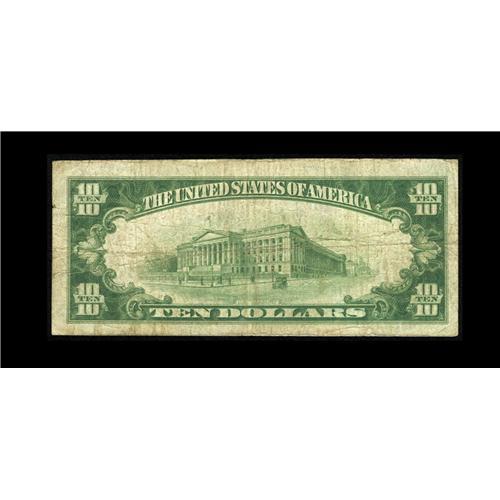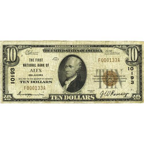 <B>Alex, OK</B></I> - $10 1929 Ty. 1 <B>The First NB</B></I> Ch. # 10193<BR>A just plain scarce note from the only issuer in this tiny Grady County community. The Gengerke data shows a gap of almost ten years since the last public offering of any kind from here. Evenly circulated <B>About Fine.</B></I>