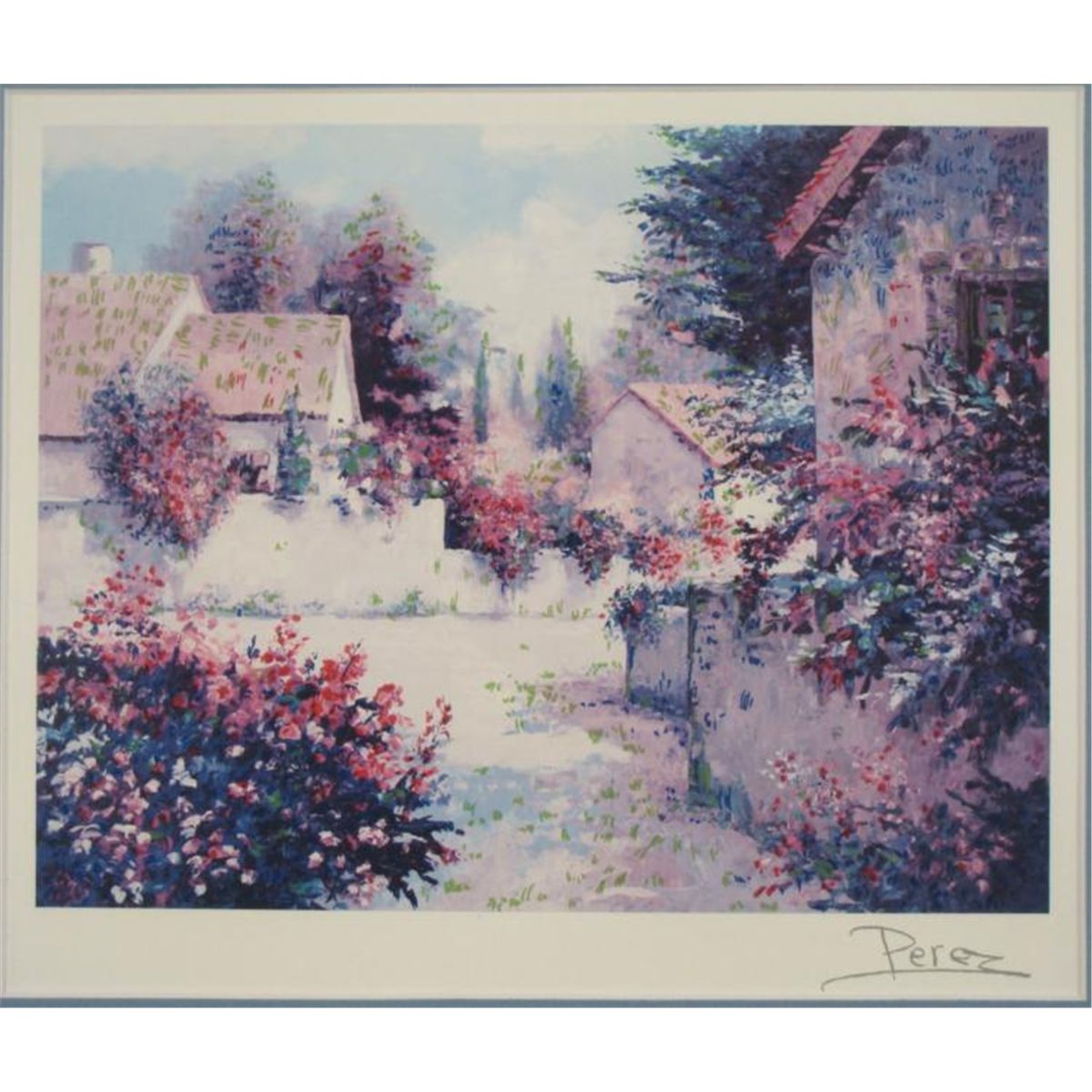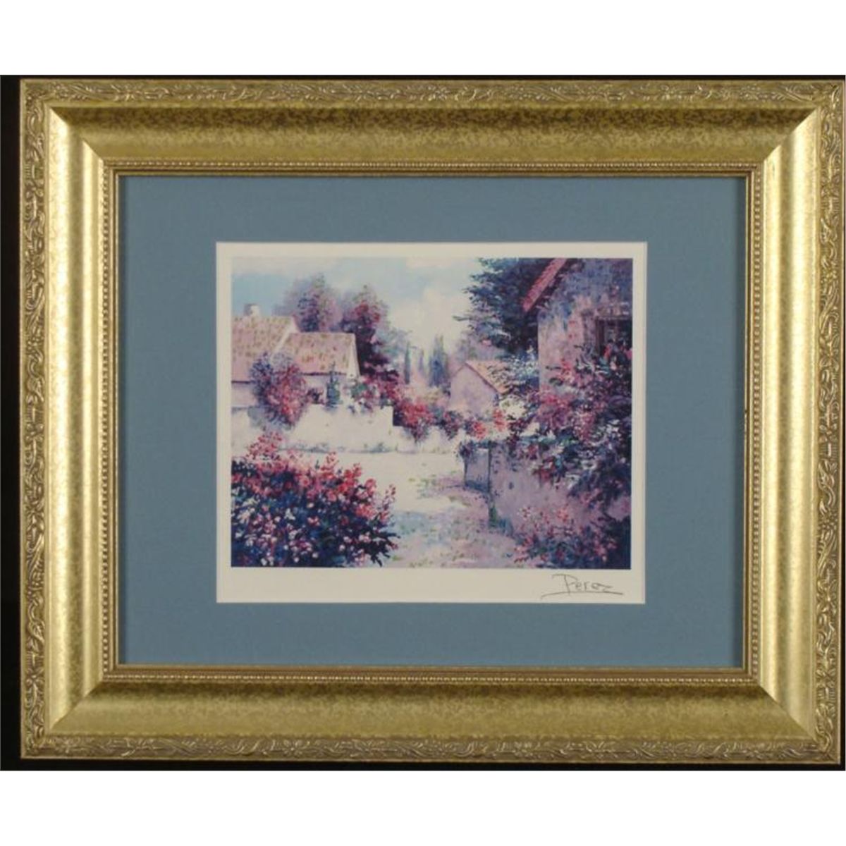 Here is a quaint springtime scene in a European country village. The bright flowers appear to extend their glorious pink hues onto the rooftops of the cottages. * Artist: Alex PerezSignature: Last name signed in the plate, lower rightTitle: Village View IIIMedium: Seriolithograph on paperDate: 1999Image size: 6 3/4 x 8 3/4 inchesFraming: Matted in sky blue, in gold fleck painted wood frameFrame size: 14 3/4 x 17 3/4 inches Condition: Excellent Certificate of Authenticity: from Park West Gallery Biography: * I'm an independent artist, born in Santiago, Chile, in 1946, a fourth generation artist, "I express my own artistic passion by recording nature on the canvas in a conventional realist manner." * In August 2009 I founded the PEREZ FINE ART GALLERIES online, with the purpose to build a bridge between artists and art collectors. * I have exhibited in several countries, my works are included in private and public collections worldwide. After graduating from the Academy of Fine Arts in Santiago, I worked in my father's studio - the Spanish-Chilean painter Eduardo Perez - where I acquired most of my artistic knowledge and skill. I currently reside in Chile."Perez's paintings fuses a sophisticated color sensibility with a contemporary realism approach. He seeks out subjects that reflect a peaceful and harmonious ambiance, as a means of transporting the viewer to a serene contemplative visual experience. His landscapes and coastal view's atmosphere imbibes the shifting of light as day progresses from dawn to dusk and back again, the vividness of colors breathing life and vitality in to the canvas""Beauty and Simpleness" is the artwork key of Perez's painting". * - from the artist's website *