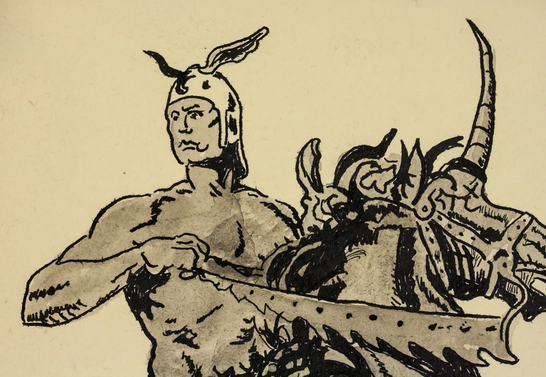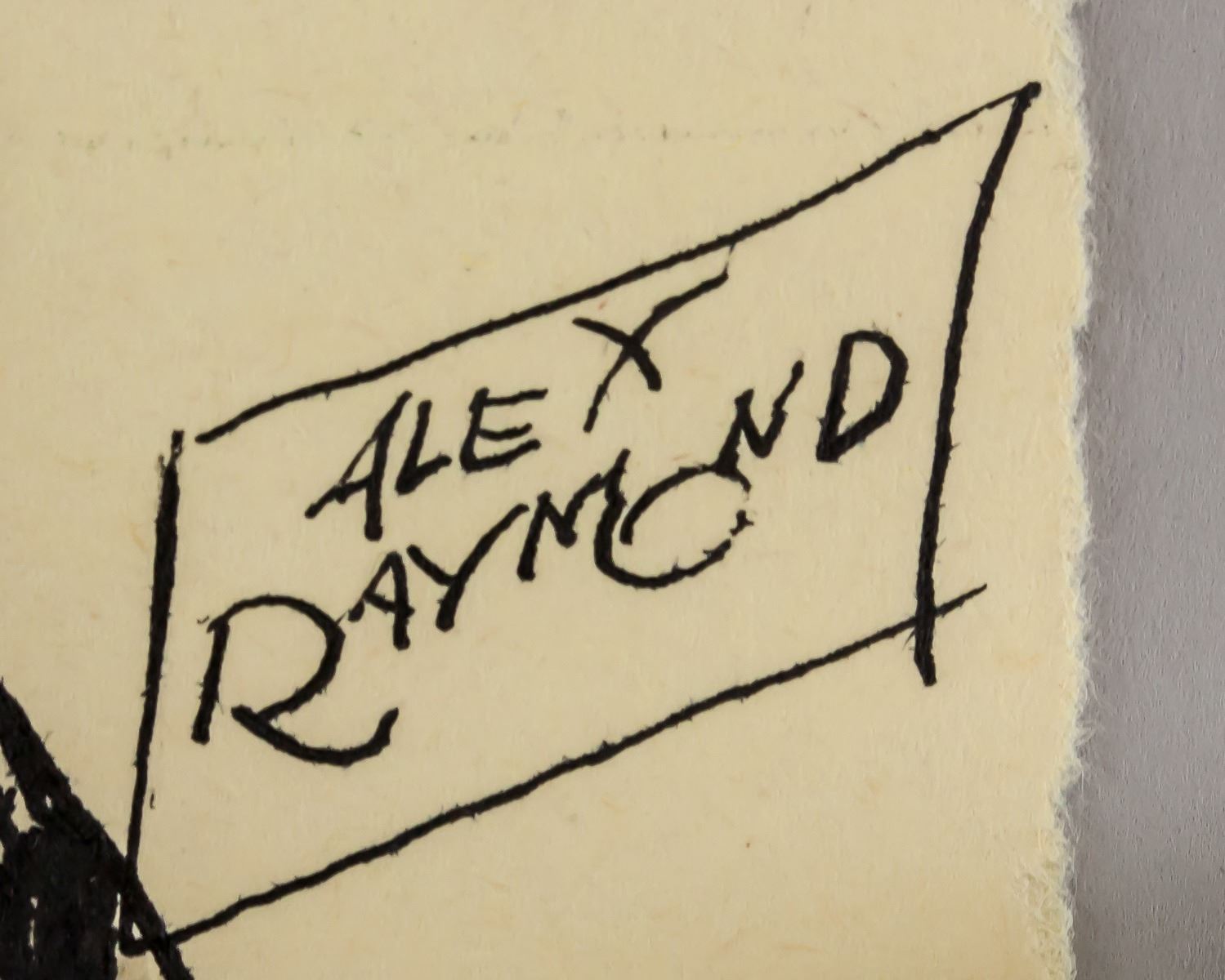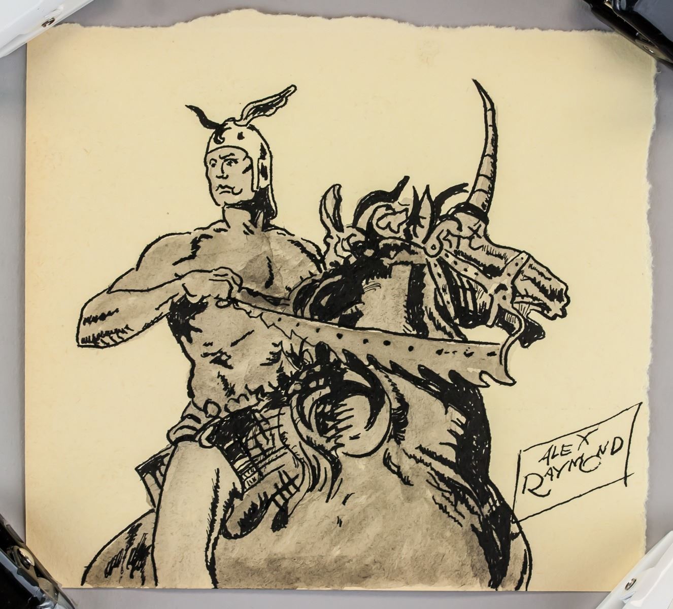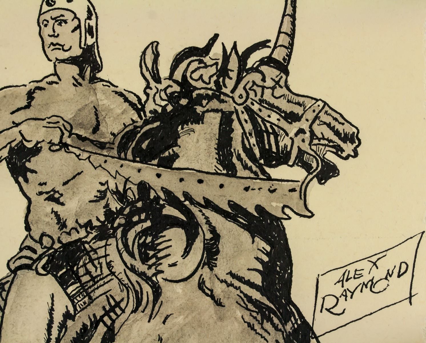 Mixed media on paper. Featuring a man atop a horse. Signed ALEX RAYMOND on the lower right corner. Inscribed 1940 on the lower right corner on verso. 13 x 15 cm (5.1 x 5.9 inches). PROVENANCE: Southern Ontario estate