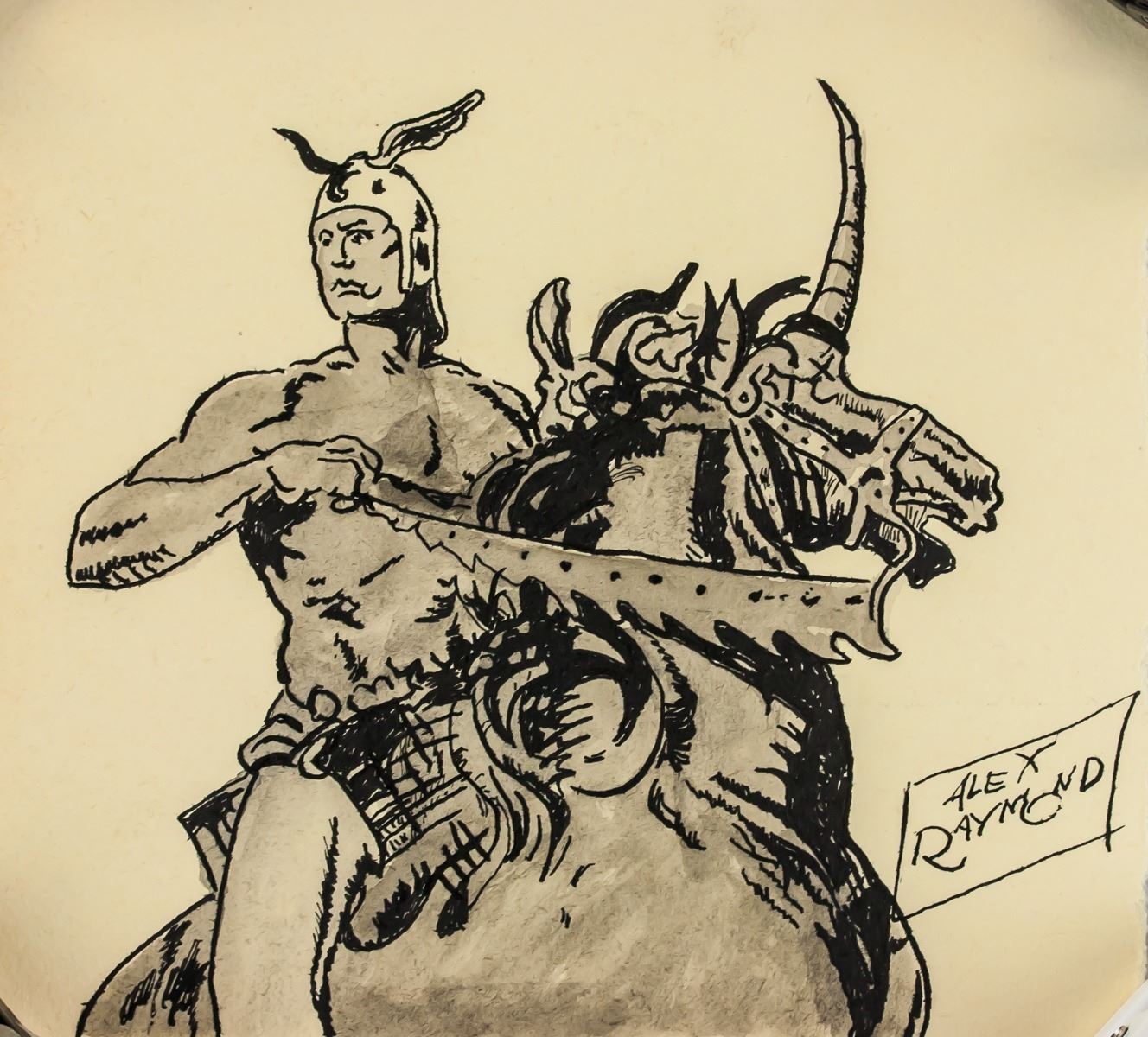 Mixed media on paper. Featuring a man atop a horse. Signed ALEX RAYMOND on the lower right corner. Inscribed 1940 on the lower right corner on verso. 13 x 15 cm (5.1 x 5.9 inches). PROVENANCE: Southern Ontario estate