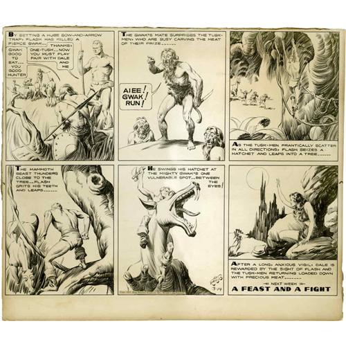 <B>Alex Raymond - Flash Gordon Sunday Comic Strip Original Art, dated 3-14-37 (King Features Syndicate, 1937).</B></I> Alex Raymond was a cartooning <I>wunderkind</B></I> who was never content with his achievements or drawing techniques, but instead was driven to experiment with fresh approaches to comic strip storytelling. During an acclaimed period of 1936-38, Raymond brought an unparalleled feeling of romance to <I>Flash Gordon</B></I>. His lush drybrush inking was inspired by the work of "hall of fame" illustrators Matt Clark and John LaGatta. Writer Don Moore stocked the <I>Flash Gordon</B></I> storyline with pulp magazine archetypes that combined such seemingly incongruous elements as science fiction gadgets with swashbuckling costumes and physical stunts. Thus, ray guns, sword fights, space ships, alien animal mounts, space helmets, and Arthurian capes, were all mixed together to create an epic fantasy adventure that transcended any earthly time period or geography. This Sunday showcases Flash Gordon's unmatchable athleticism and heroism. Panel five is a famous, oft-reproduced scene of Flash's triumph over near-insurmountable adversity, as he single-handedly fells a rampaging behemoth, the dinosaur-like Gwak. In keeping with the primitive motif of this episode, Dale Arden takes center stage in the final panel, and she goes tribal, decked out in a fur bikini that would turn even Raquel Welch, buxom star of "One Million B.C.," green with envy. This spectacular Sunday has been long held in a Raymond family member's collection and is being offered to the marketplace for the first time. In addition to this Sunday, the lot also includes a print made from a candid family snapshot of Alex Raymond relaxing at his Westport, Connecticut home, shortly before his tragic death. The strip has an image area of 20" x 16". The illustration board has been light struck around the edges; otherwise the art is in Very Good condition. Don't miss this opportunity to land a fantastic <I>Flash Gordon</B></I> strip from a peak period!