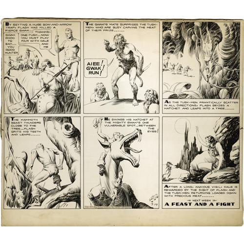 <B>Alex Raymond - Flash Gordon Sunday Comic Strip Original Art, dated 3-14-37 (King Features Syndicate, 1937).</B></I> Alex Raymond was a cartooning <I>wunderkind</B></I> who was never content with his achievements or drawing techniques, but instead was driven to experiment with fresh approaches to comic strip storytelling. During an acclaimed period of 1936-38, Raymond brought an unparalleled feeling of romance to <I>Flash Gordon</B></I>. His lush drybrush inking was inspired by the work of "hall of fame" illustrators Matt Clark and John LaGatta. Writer Don Moore stocked the Flash Gordon storyline with pulp magazine archetypes that combined such seemingly incongruous elements as science fiction gadgets with swashbuckling costumes and physical stunts. Thus, ray guns, sword fights, space ships, alien animal mounts, space helmets, and Arthurian capes, were all mixed together to create an epic fantasy adventure that transcended any earthly time period or geography. This Sunday showcases Flash Gordon's unmatchable athleticism and heroism. Panel five is a famous, oft-reproduced scene of Flash's triumph over near-insurmountable adversity, as he single-handedly fells a rampaging behemoth, the dinosaur-like Gwak. In keeping with the primitive motif of this episode, Dale Arden takes center stage in the final panel, and she goes tribal, decked out in a fur bikini that would turn even Raquel Welch, buxom star of "One Million Years B.C.," green with envy. This spectacular Sunday has been long held in a Raymond family member's collection and is being offered to the public for the first time. In addition to this Sunday, the lot also includes a print made from a candid family snapshot of Alex Raymond relaxing at his Stamford, Connecticut home, shortly before his tragic death. The strip has an image area of 20" x 16". The illustration board has been light struck around the edges; otherwise the art is in Very Good condition. Don't miss this opportunity to land a fantastic <I>Flash Gordon</B></I> strip from a p