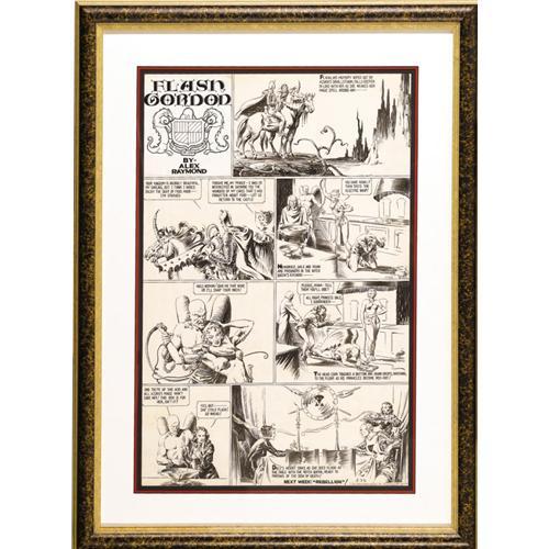 <B>Alex Raymond - Flash Gordon Sunday Comic Strip Original Art, dated 5-26-35 (King Features Syndicate, 1935).</B></I> For many collectors, Alex Raymond brought an unparalleled feeling of romance to <I>Flash Gordon</B></I> with his superlative drybrush inking of the mid-thirties. Inspired by an approach pioneered by magazine illustrators Matt Clark and John LaGatta, Raymond imbued his pulp magazine archetypes with an exotic and erotic appeal. He combined such fantasy elements as futuristic gadgets with Arthurian costumes and alien animals. This spectacular Sunday featuring Flash Gordon, Dale Arden, and Azura, the Witch Queen, hails from the brief and highly-sought-after period in which the strip was drawn at its largest -- the full-page format. This Sunday has an approximate image area of 18" x 28", is framed, and is in Excellent condition.<BR><BR><b>Shipping:</b> Framed (<a target="_blank" href="http://www.heritageauctions.com/common/shipping.php">view shipping information</a>)