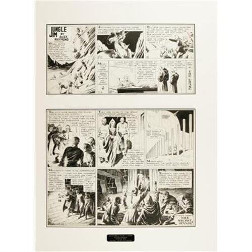 <B>Alex Raymond - Flash Gordon Sunday Comic Strip With Matching Jungle Jim Topper, Original Art, dated 2-6-38 (King Features Syndicate, 1938).</B></I> One of the finest comic strip artists ever to touch pen to paper, Alex Raymond was a master draftsman and a remarkable storyteller. Created in an attempt to cash in on the success of <I>Buck Rogers</B></I>, Raymond's <I>Flash Gordon</B></I> soon outpaced its 25th-century rival, becoming an even bigger, and longer-lasting, strip. Raymond also created <I>Jungle Jim</B></I>, which eventually ran as a "topper" to the <I>Flash Gordon</B></I> strip. Finding two matching pieces, as is the case here, is incredibly rare and desirable, making this a unique and enticing offering for any strip fan. The <I>Jungle Jim</B></I> topper has an image area of approximately 19.75" x 9.5", while the <I>Flash Gordon</B></I> piece measures approximately 19.5" x 15.5". Both pieces are in Excellent condition; the <I>Flash</B></I> is signed by Raymond, while the <I>Jungle Jim</B></I> bears the artist's stylized "R." <BR><BR><b>Shipping:</b> Flat Material, Large (<a target="_blank" href="http://www.heritageauctions.com/common/shipping.php">view shipping information</a>)