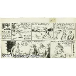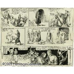 <B>Alex Raymond - Flash Gordon with Jungle Jim Topper Sunday Comic Strip Original Art, dated 10-13-35 (King Features Syndicate, 1935).</B></I> Jungle Jim and Kolo are rescued from a man-eating ant deathtrap and then Jim outshoots his black-hearted nemesis, Romney, in this action-packed episode. This <I>Jungle Jim</B></I> topper measures an overall 25.75" x 14", while its image area is 25.5" x 12", and the art is in Excellent condition. The lower portion of this set is the matching <I>Flash Gordon</B></I> Sunday. In this thriller, General Tahl's <I>coup d'etat</B></I> is overturned, and Flash Gordon is crowned King by Queen Azura; later, Flash pleads with Dale to believe that he does not love Azura, but rather, intends to marry Dale. Flash Gordon, Dale Arden, and Dr. Zarkov all star. The period of 1934-36 is often cited as the most desirable to <I>Flash Q collectors due to the large size of the art drawn during those three years, as well as Alex Raymond's lush dry-brush inking, which was influenced by the work of magazine illustrators John LaGatta and Matt Clark. The overall size of the illustration board measures 26" x 20.75", while the image area is 25.5" x 20", and the condition of the art is Excellent. Don't let this remarkable gem slip past you without a bid! 2 Original Art