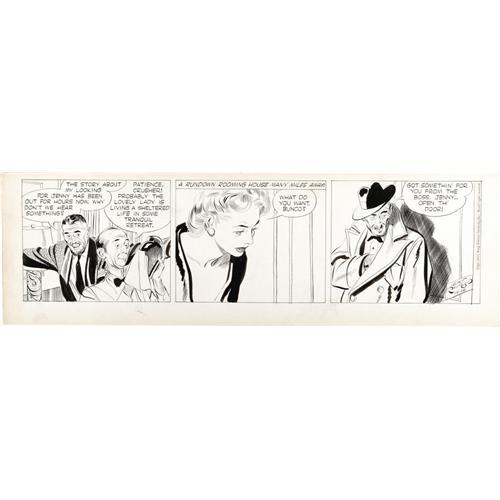 Twickham angsts about the whereabouts of his lady love, Jenny Robbins, while at a rundown rooming house, Miss Robbins receives an unsolicited call from Sharp Haskins' hitman, Bunco Bates, in this extraordinary daily by Alex Raymond. The art has an image area measuring 20" x 5.25", and is in Excellent condition.<BR><BR><b>Shipping:</b> Large Flat (<a target="_blank" href="http://www.heritageauctions.com/common/shipping.php">view shipping information</a>)