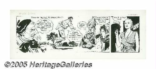 <B>Alex Raymond - Rip Kirby Daily Comic Strip Original Art, dated 8-11-49 (King Features Syndicate, 1949).</B></I> Alex Raymond displays his brilliance at "spotting" dramatic areas of black ink while maintaining a realistic portrayal of the figures in this daily. Panel one is an effective montage scene that ties together three developing plot threads and it features a fine portrait of Rip. The image area of the art is approximately 18.5" x 5.5", and the strip is in Excellent condition.