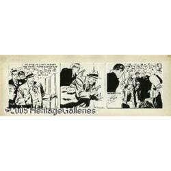 <B>Alex Raymond - Rip Kirby Daily Comic Strip Original Art, dated 3-9-50 (King Features Syndicate, 1950).</B></I> "Thick and thin" line contrasts are featured in the lively inking of this daily. This daily features a scarce scene of Rip with gun drawn; sensational portraits of Rip appear in every panel. Once again, Alex Raymond demonstrates why he was the ultimate adventure comic strip illustrator. The image area of the strip is 18.5" x 5.5", and the art is in Excellent condition.
