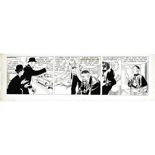 <B>Alex Raymond - Rip Kirby Daily Comic Strip Original Art, dated 2-20-54 (King Features Syndicate, 1954).</B></I> Desmond and Crusher carry this <I>Rip Kirby</B></I> daily from 1954. Once again, Alex Raymond demonstrates why he was the ultimate adventure comic strip illustrator. The image area is 20" x 5.5". There is a small glue stain in the right word balloon in the second panel, otherwise the art is in Excellent condition. <BR><BR><B>Important notice:</B> Heritage usually auctions material at the rate of 200-250 lots per hour. On some occasions eBay Live bid software or the Internet may not be able to keep up with the pace of the auction. We recommend placing a realistic absentee bid now as insurance to avoid disappointment. Occasionally the auctioneer may eliminate or reject an eBay Live bid, and the auctioneer may also reopen a lot after the close of the eBay live bidding (usually because we missed an audience bid), and may reject your bid even if it shows you as the winning bidder. By bidding via eBay Live, you agree that Heritage may award the lot to another bidder at its sole discretion under the circumstances described above or any other reasonable circumstances. Since eBay bids are not shown to us until we open the lot on the floor, we treat those bids just like floor bids. In most cases the floor responds before the eBay bid is presented to us, due to Internet lag time, so for consistency we have made it a policy that floor bids are always considered first over tie eBay live bids. Also please note that all Heritage lots purchased through eBay Live carry a 22.5% Buyer's Premium. Please make sure you read the Terms and Conditions before you bid. This lot is being auctioned in conjunction with a live floor auction by Heritage Auction Galleries. All final auction and invoice information will be supplied by Heritage Auction Galleries, and all other information should be considered preliminary. Lot:41001 <BR><BR><B>Winning Notification and Billing:</B> After the FINAL session in this auction is complete, Heritage will send e-mail and snail mail invoices. This process normally takes several days. All final auction and invoice information will be supplied by Heritage Auction Galleries, and all other information should be considered preliminary. <BR><BR>This auction will be conducted on a live auction floor and over the Internet through eBay Live. If you choose to place an absentee bid, please take a moment to <font color='#0000ff'><u><a href='http://pages.ebay.com/liveauctions/help/before/laabsentee.html'>learn how eBay Live absentee bidding works</a></u></font><font color='#000000'>