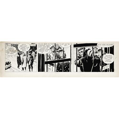 <B>Alex Raymond - Rip Kirby Daily Comic Strip Original Art, dated 3-5-54 (King Features Syndicate, 1954).</B></I> Rip Kirby has strong-man, Crusher, help him do a little "bending and entering," in this cool Alex Raymond daily. The image area measures 18.5" x 5.5", and the condition is Very Good.<BR><BR><b>Shipping:</b> Large Flat (<a target="_blank" href="http://www.heritageauctions.com/common/shipping.php">view shipping information</a>)
