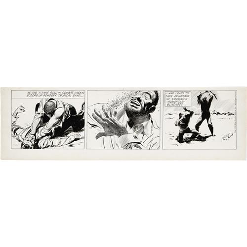 <B>Alex Raymond - Rip Kirby Daily Comic Strip Original Art, dated 4-1-54 (King Features Syndicate, 1954).</B></I> The sweep and beauty of Alex Raymond’s draftsmanship is evident in this 1954 daily, which features two men fighting on a tropical island. The image area measures 20" x 5.25", and the condition is Very Good.<BR><BR><b>Shipping:</b> Large Flat (<a target="_blank" href="http://www.heritageauctions.com/common/shipping.php">view shipping information</a>)