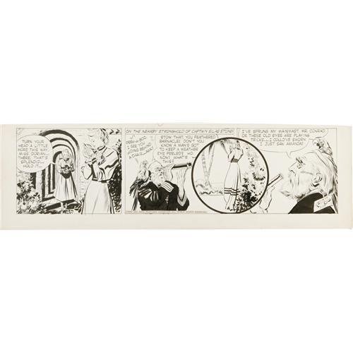 <B>Alex Raymond - Rip Kirby Daily Comic Strip Original Art, dated 2-25-53 (King Features Syndicate, 1953).</B></I> Honey Dorian took the limelight in this superbly staged daily. Two superb portraits of aged Captain Silas Stone add a wonderful contrast to Honey's youthful beauty. The image area is approximately 18.5" x 5.5", and the strip is in Excellent condition. <BR><BR><b>Shipping:</b> Flat Material, Large (<a target="_blank" href="http://www.heritageauctions.com/common/shipping.php">view shipping information</a>)