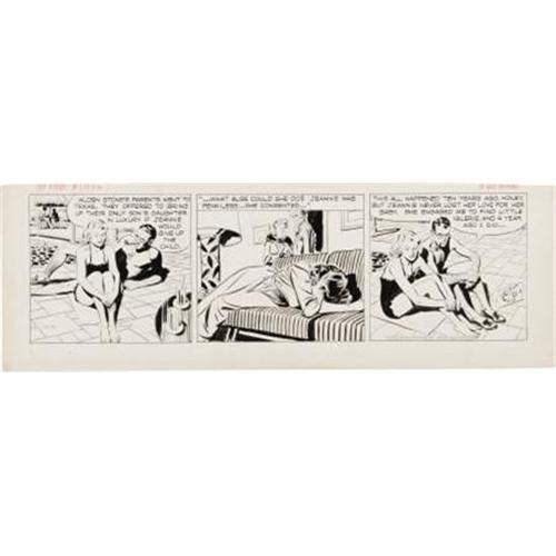 <B>Alex Raymond - Rip Kirby Daily Comic Strip Original Art, dated 9-9-49 (King Features Syndicate, 1949).</B></I> In this daily, the lovely Honey Dorian and Rip Kirby have a poolside chat. One of the finest comic strip artists ever, Alex Raymond was a master draftsman who was also a superb storyteller. The image area of this strip measures approximately 18.5" x 5.5", and the art is in Excellent condition.<BR><BR><b>Shipping:</b> Flat Material, Small (<a target="_blank" href="http://www.heritageauctions.com/common/shipping.php">view shipping information</a>)