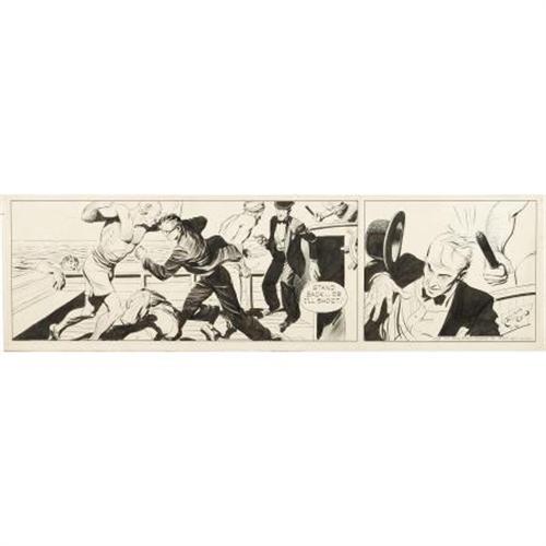 <B>Alex Raymond - Rip Kirby Daily Comic Strip Original Art, dated 11-16-51 (King Features Syndicate, 1951).</B></I> Desmond takes a shot to the skull while Rip dishes out a few blows of his own in this action-packed episode. This daily has an approximate image area of 20" x 5.25", and aside from some paper aging, glue stains on the back, and a fold between panels one and two, the art is in Good condition. <I>From the Jim Logan Collection.</B></I><BR><BR><b>Shipping:</b> Flat Material, Small (<a target="_blank" href="http://www.heritageauctions.com/common/shipping.php">view shipping information</a>)