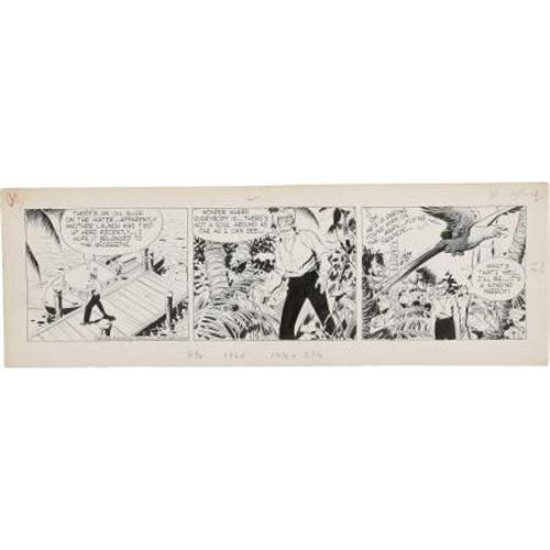 <B>Alex Raymond - Rip Kirby Daily Comic Strip Original Art, dated 4-6-53 (King Features Syndicate, 1953).</B></I> Rip Kirby spots Mr. Conrad, the singing parrot, in this fast-paced episode. This strip has an approximate image area of 20" x 5.25", and the art is in Excellent condition.<BR><BR><b>Shipping:</b> Flat Material, Small (<a target="_blank" href="http://www.heritageauctions.com/common/shipping.php">view shipping information</a>)