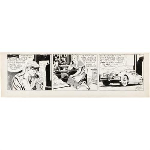 <B>Alex Raymond - Rip Kirby Daily Comic Strip Original Art, dated 10-15-53 (King Features Syndicate, 1953).</B></I> Alex Raymond's bold use of black shapes and patterns create a "painterly" approach on the art for this three-paneled episode as Raymond minimized his use of outlines around the background forms and figures. This daily has an approximate image area of 20" x 5.25", and the art is in Excellent condition.<BR><BR><b>Shipping:</b> Flat Material, Small (<a target="_blank" href="http://www.heritageauctions.com/common/shipping.php">view shipping information</a>)