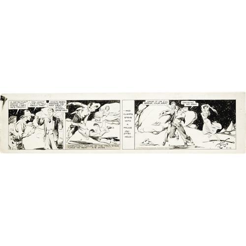 <B>Alex Raymond - Secret Agent X-9 Daily Comic Strip Original Art, dated 11-12-34 (King Features Syndicate, 1934).</B></I> X-9 was an agent so secret that even we, the readers, for years, never knew his true name, country of origin, or even what agency he worked for. Originally written and created by noted mystery author Dashiell Hammett (best known for crime noir novels such as <B>The Maltese Falcon</B></I>, <B>The Thin Man</B></I>, and <B>The Glass Key</B></I>), the strip boasted some of the best art on the comics page. This hard-hitting daily is a real beauty, and one can detect the influence of pulp magazine illustrator Matt Clark on Alex Raymond's drybrush inking technique. This daily has an image area of 25" x 5.5", and the art is in Excellent condition. <BR><BR><B>Important notice:</B> Heritage usually auctions material at the rate of 200-250 lots per hour. On some occasions eBay Live bid software or the Internet may not be able to keep up with the pace of the auction. We recommend placing a realistic absentee bid now as insurance to avoid disappointment. Occasionally the auctioneer may eliminate or reject an eBay Live bid, and the auctioneer may also reopen a lot after the close of the eBay live bidding (usually because we missed an audience bid), and may reject your bid even if it shows you as the winning bidder. By bidding via eBay Live, you agree that Heritage may award the lot to another bidder at its sole discretion under the circumstances described above or any other reasonable circumstances. Since eBay bids are not shown to us until we open the lot on the floor, we treat those bids just like floor bids. In most cases the floor responds before the eBay bid is presented to us, due to Internet lag time, so for consistency we have made it a policy that floor bids are always considered first over tie eBay live bids. Also please note that all Heritage lots purchased through eBay Live carry a 22.5% Buyer's Premium. Please make sure you read the Terms and Conditions before you bid. This lot is being auctioned in conjunction with a live floor auction by Heritage Auction Galleries. All final auction and invoice information will be supplied by Heritage Auction Galleries, and all other information should be considered preliminary. Lot:41001 <BR><BR><B>Winning Notification and Billing:</B> After the FINAL session in this auction is complete, Heritage will send e-mail and snail mail invoices. This process normally takes several days. All final auction and invoice information will be supplied by Heritage Auction Galleries, and all other information should be considered preliminary. <BR><BR>This auction will be conducted on a live auction floor and over the Internet through eBay Live. If you choose to place an absentee bid, please take a moment to <font color='#0000ff'><u><a href='http://pages.ebay.com/liveauctions/help/before/laabsentee.html'>learn how eBay Live absentee bidding works</a></u></font><font color='#000000'>