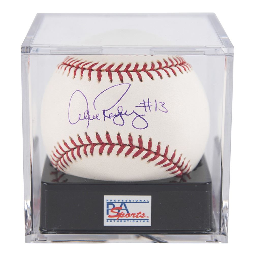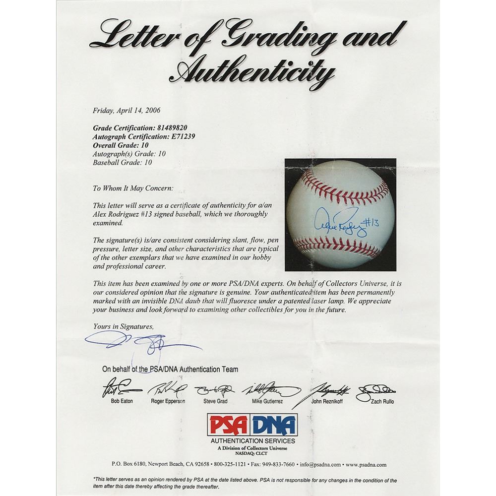 Official Rawlings Major League (Selig) baseball signed in blue ballpoint on the sweet spot, "Alex Rodriguez #13." In very fine condition. Encapsulated and graded by PSA/DNA as "GEM MINT 10," and accompanied by a full letter of authenticity and grading.