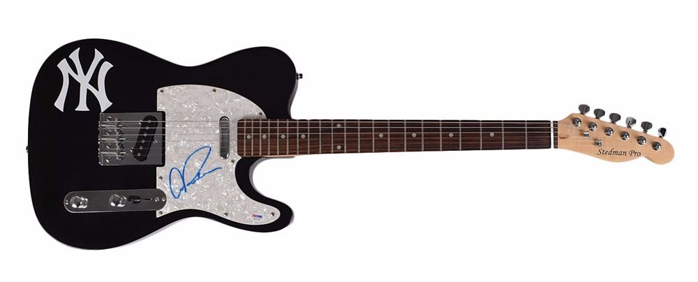 Black-bodied Stedman Pro 'telecaster-style' electric guitar featuring an applied New York Yankees logo, signed on the pearloid pickguard in blue felt tip by Alex Rodriguez. In fine condition, with a PSA/DNA label affixed to the pickguard. Accompanied by a certificate of authenticity from PSA/DNA.