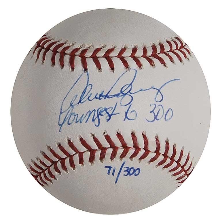 Official limited edition Rawlings Major League baseball, #71/300, signed in blue ballpoint on the sweet spot, “Alex Rodriguez, Youngest to 300.” In fine condition. Pre-certified Steve Grad/PSA/DNA and RRAuction COA.