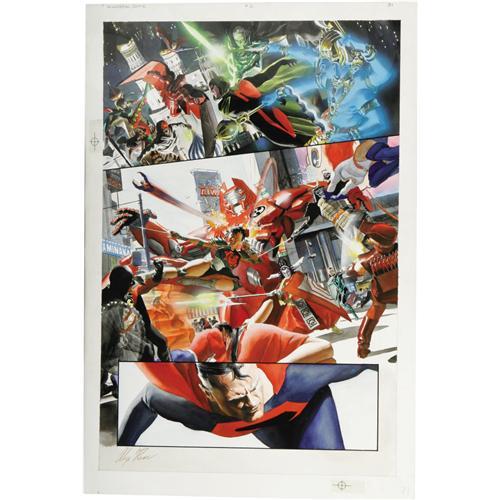 <B>Alex Ross - Kingdom Come #2, page 31 Original Art (DC, 1996).</B></I> We've offered some amazing Alex Ross art in the past, but seldom a page so jam-packed with battling superfolk. This star-studded page from Kingdom Come -- part of the prestige series written by Mark Waid -- features an elderly Superman. As always, Ross' work is simply astounding, and must be seen in person to be believed. The image area measures 12" x 17.5" and the art is in Excellent condition. Also included in this lot is a vellum overlay with the lettering for the word balloons and captions.<BR><BR><b>Shipping:</b> Flat Material, Large (<a target="_blank" href="http://www.heritageauctions.com/common/shipping.php">view shipping information</a>)