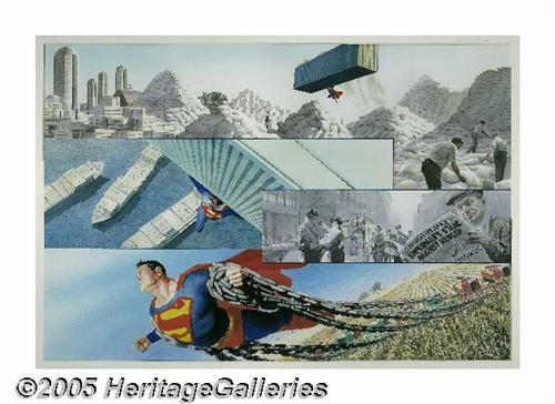 <B>Alex Ross - Superman: Peace on Earth 2-page Splash Original Art (DC, 1998).</B></I> Superman attempts to wipe out world hunger, and he's not afraid to apply a little Kryptonian elbow grease to get the job done. This evocative montage by fan-favorite Alex Ross details Supes' attempts to help mankind help themselves. <B>Superman: Peace on Earth</B></I> was the first in a series of oversized prestige-format books written by Paul Dini, and released each year at Christmas. As always, Ross's draftsmanship and command of color is stunning. The image area measures 25.5" x 17.5" and the art is in Excellent condition.