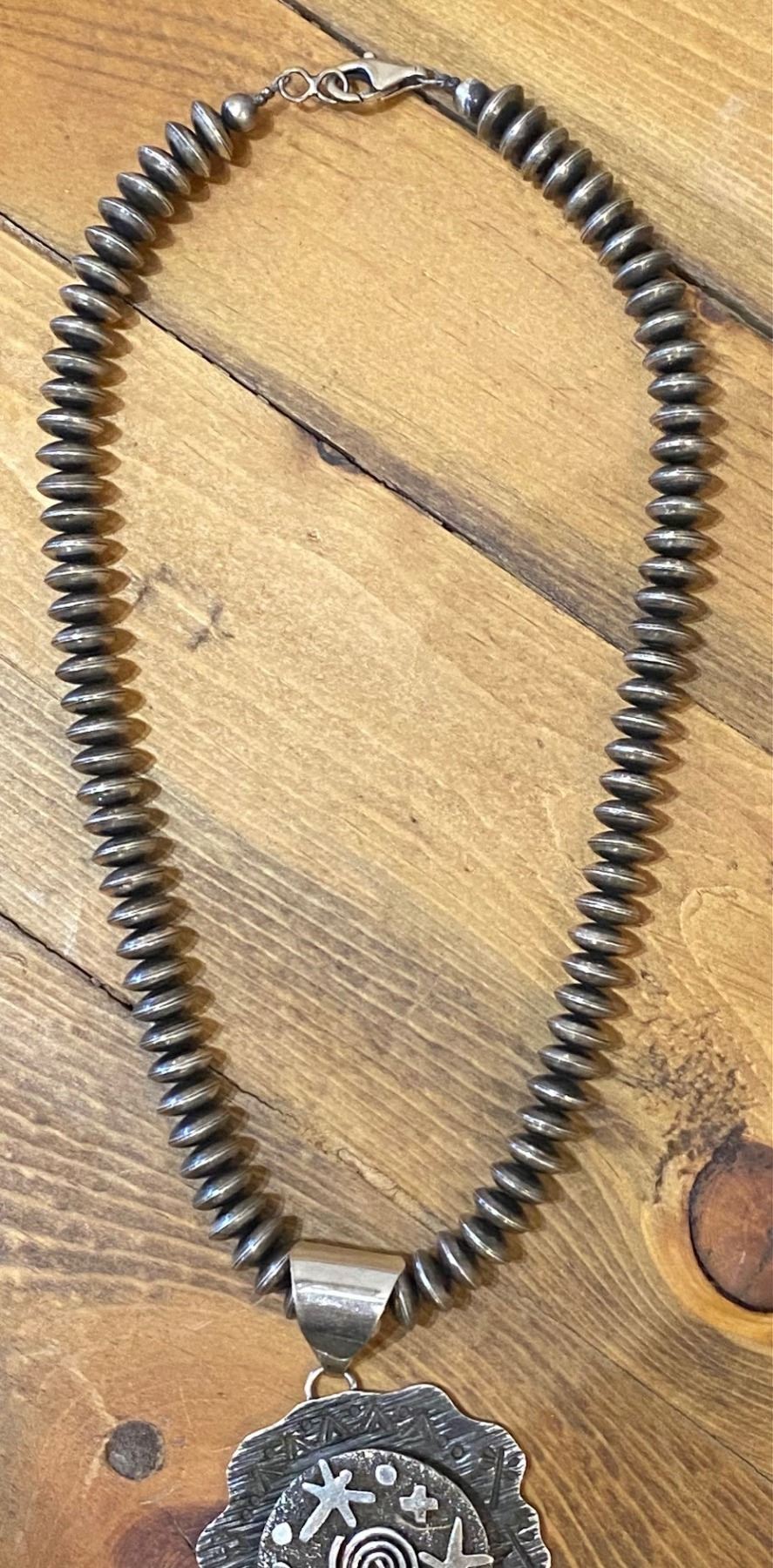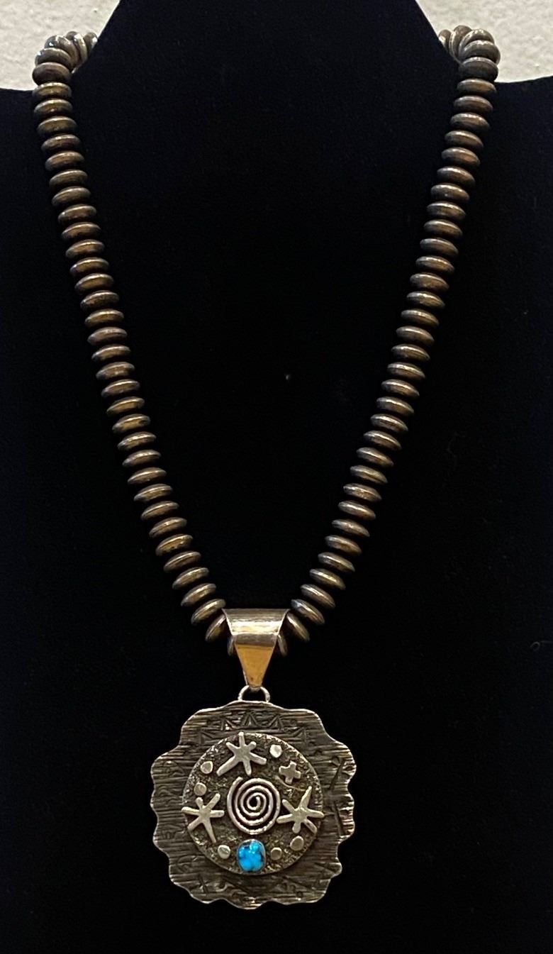 Alex Sanchez, Navajo jewelry designer created this awesome Pendant and Navajo Pearl set. Dragonflies with turquoise. Pendant is 2 inch round, bale 1 inch Navajo Pearls 19 inches long 92 grams
