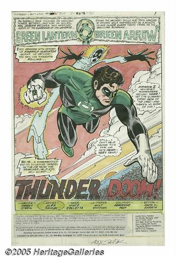 <B>Alex Saviuk and Vince Colletta - Green Lantern #105, Hand Colored Splash Page 1 Original Art (DC, 1978).</B></I> The Emerald Gladiator scans the ground and sky for the vanished Airwave II, and can't shake the feeling that he's very near. What he doesn't know is that his cousin is now a disembodied entity, floating near Hal Jordan, but helpless and silent! The image area of the art measures 10" x 15" and the art is in Excellent condition. The original art has been professional hand colored with markers. The art includes the original indicia photostat paste-ups. Signed by Alex Saviuk.