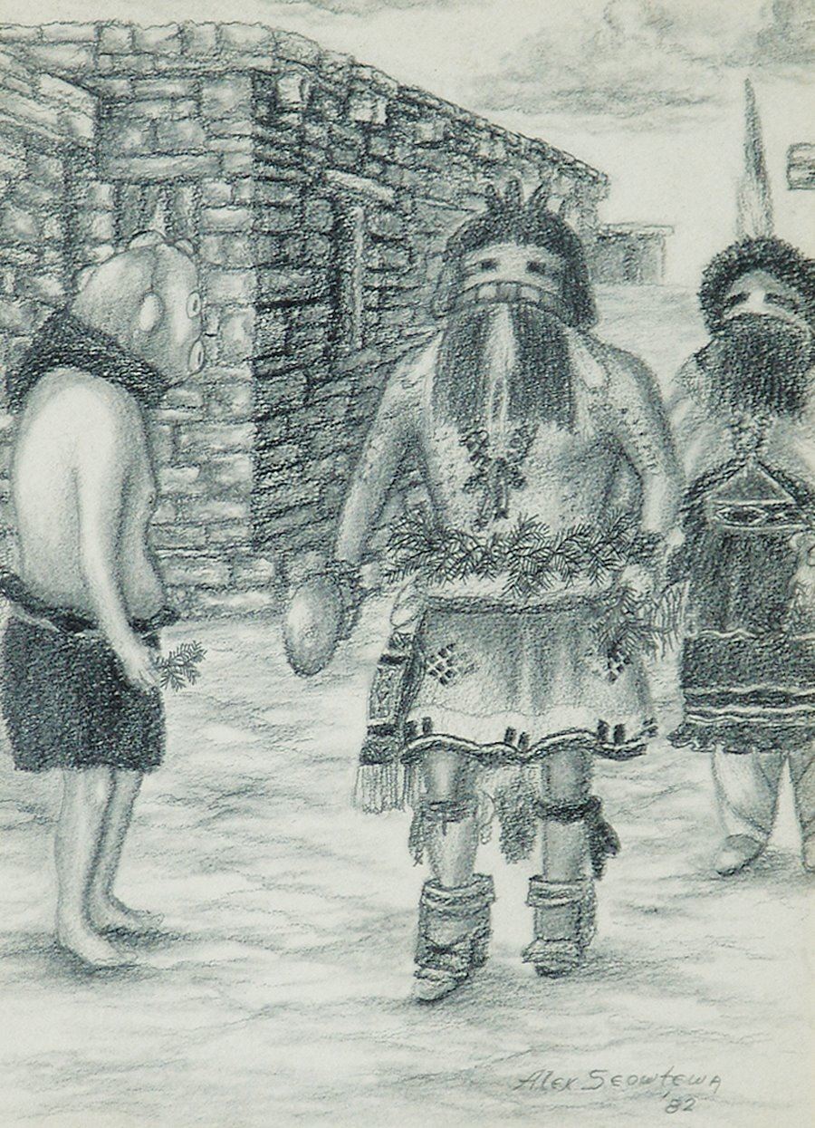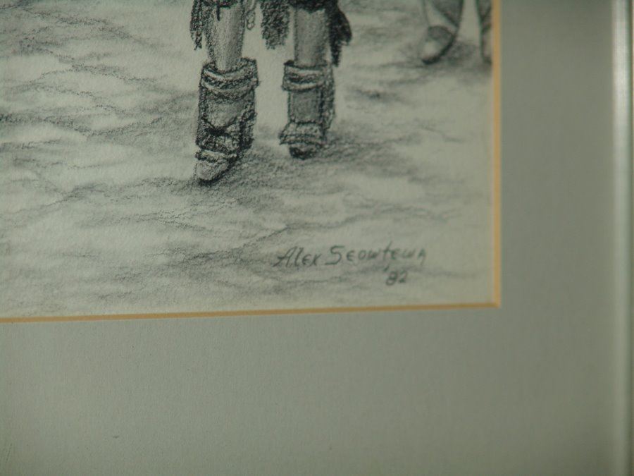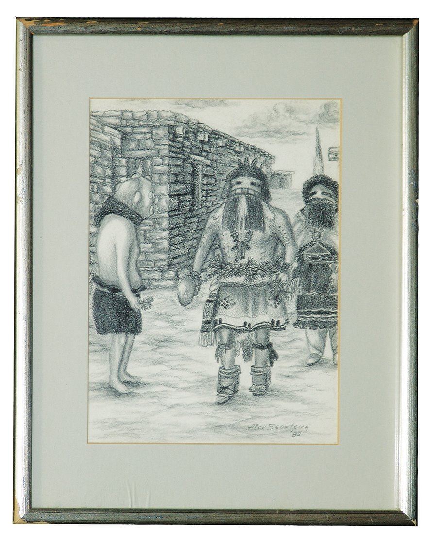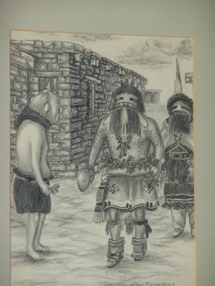 Signed original pencil on paper showing a Heyoto and a Heyoto Mana kachina dancing past a mudhead. Very good condition, matted and framed.,,11" x 8" (16" x 12")