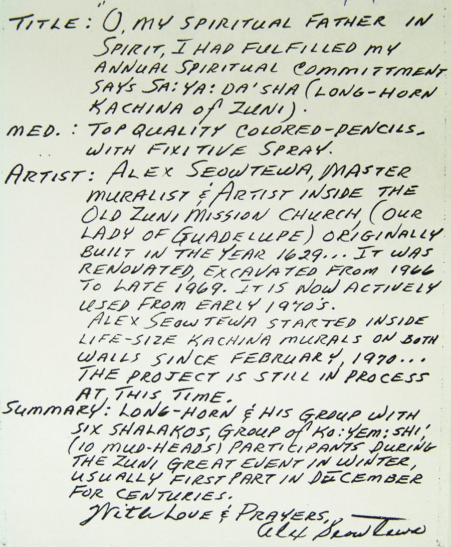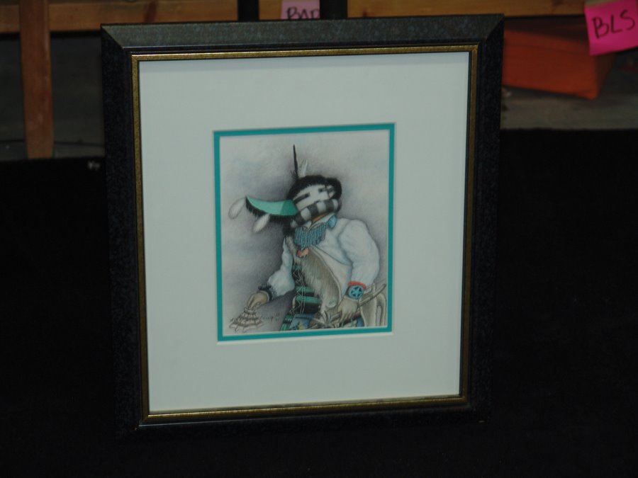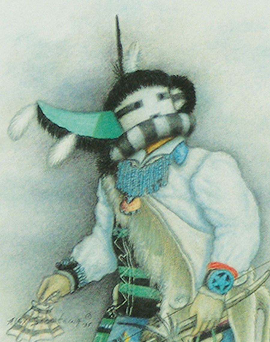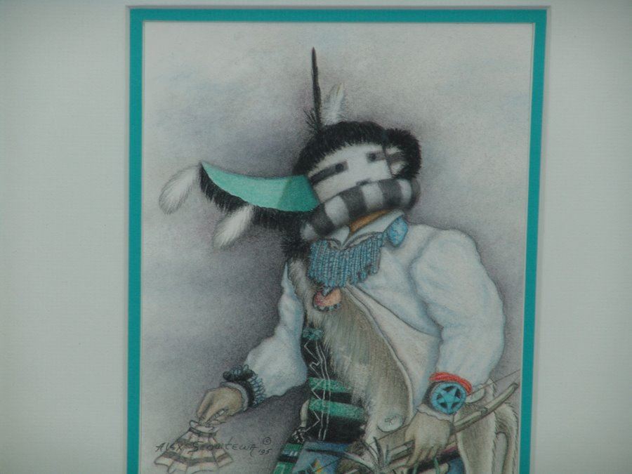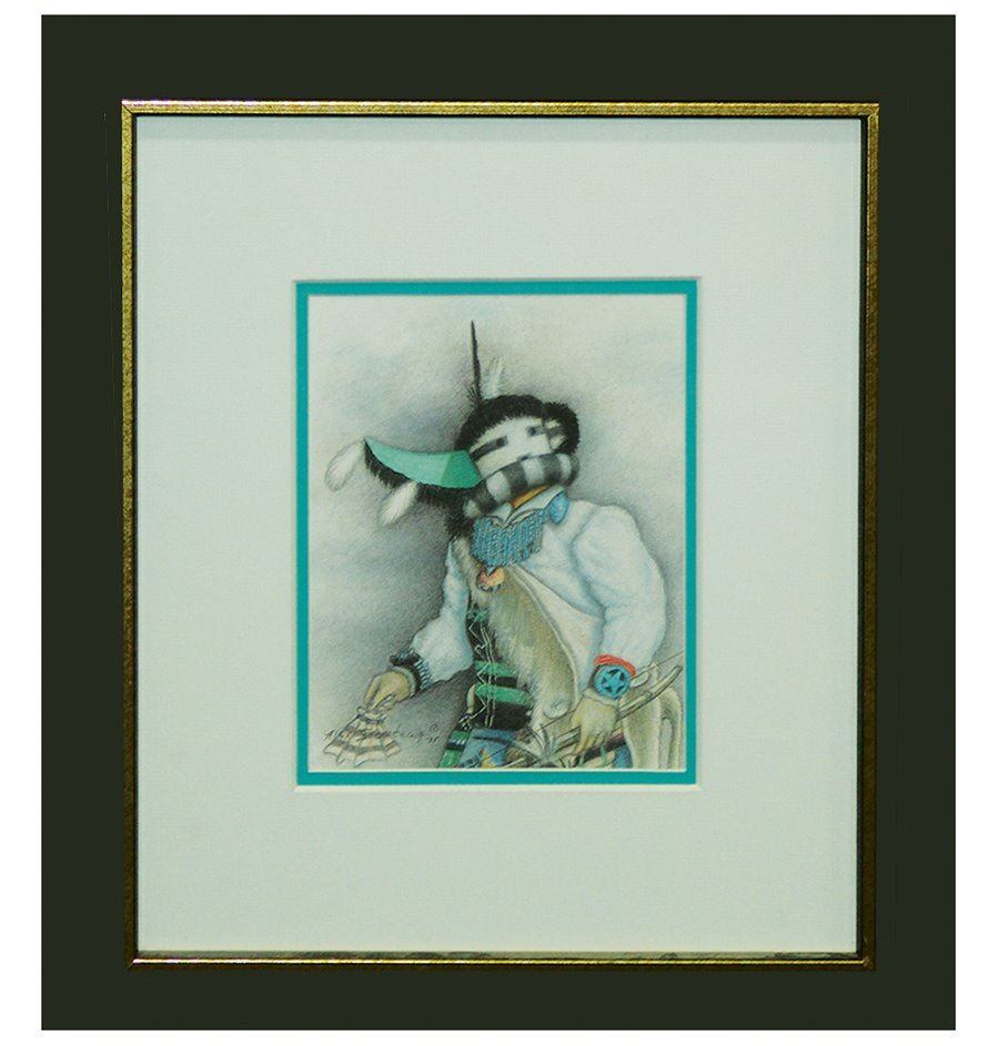 Signed original colored pencil on paper depicting the "Wupa Ala" on long-horned kachina. Very good condition. Double matted and framed.,,8-1/4" x 6-3/4" (16" x 15")