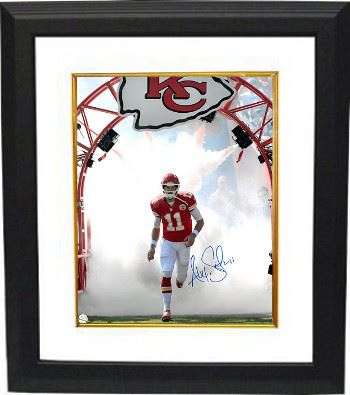 Alex Smith plays quarterback for the Kansas City Chiefs of the National Football League. He was the first overall pick by the San Francisco 49ers in the 2005 NFL Draft. According to Kansas City's quarterbacks coach, Smith is "super intelligent" and has all of the intangibles that he looks for in a quarterback. The Chiefs were the last unbeaten team in the 2013 NFL season with Smith winning his first nine regular-season starts, gaining 1,919 passing yards with 9 TDs compared to 4 INTs. Alex Smith has hand signed this Kansas City Chiefs 16x20 Photo. Alex Smith Hologram and Certificate of Authenticity from Athlon Sports Collectibles. Custom White Mat and Premium Black Frame as shown
