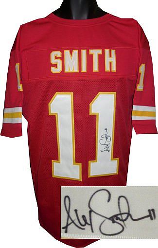 Alex Smith plays quarterback for the Kansas City Chiefs of the National Football League. He was the first overall pick by the San Francisco 49ers in the 2005 NFL Draft. According to Kansas City's quarterbacks coach, Smith is "super intelligent" and has all of the intangibles that he looks for in a quarterback. The Chiefs were the last unbeaten team in the 2013 NFL season with Smith winning his first nine regular-season starts, gaining 1,919 passing yards with 9 TDs compared to 4 INTs. This is an Alex Smith Kansas City Chiefs signed Red unlicensed custom-prostyle jersey with twill stitched nameplate and numbers. Size XL. Certificate of Authenticity from Athlon Sports Collectibles.