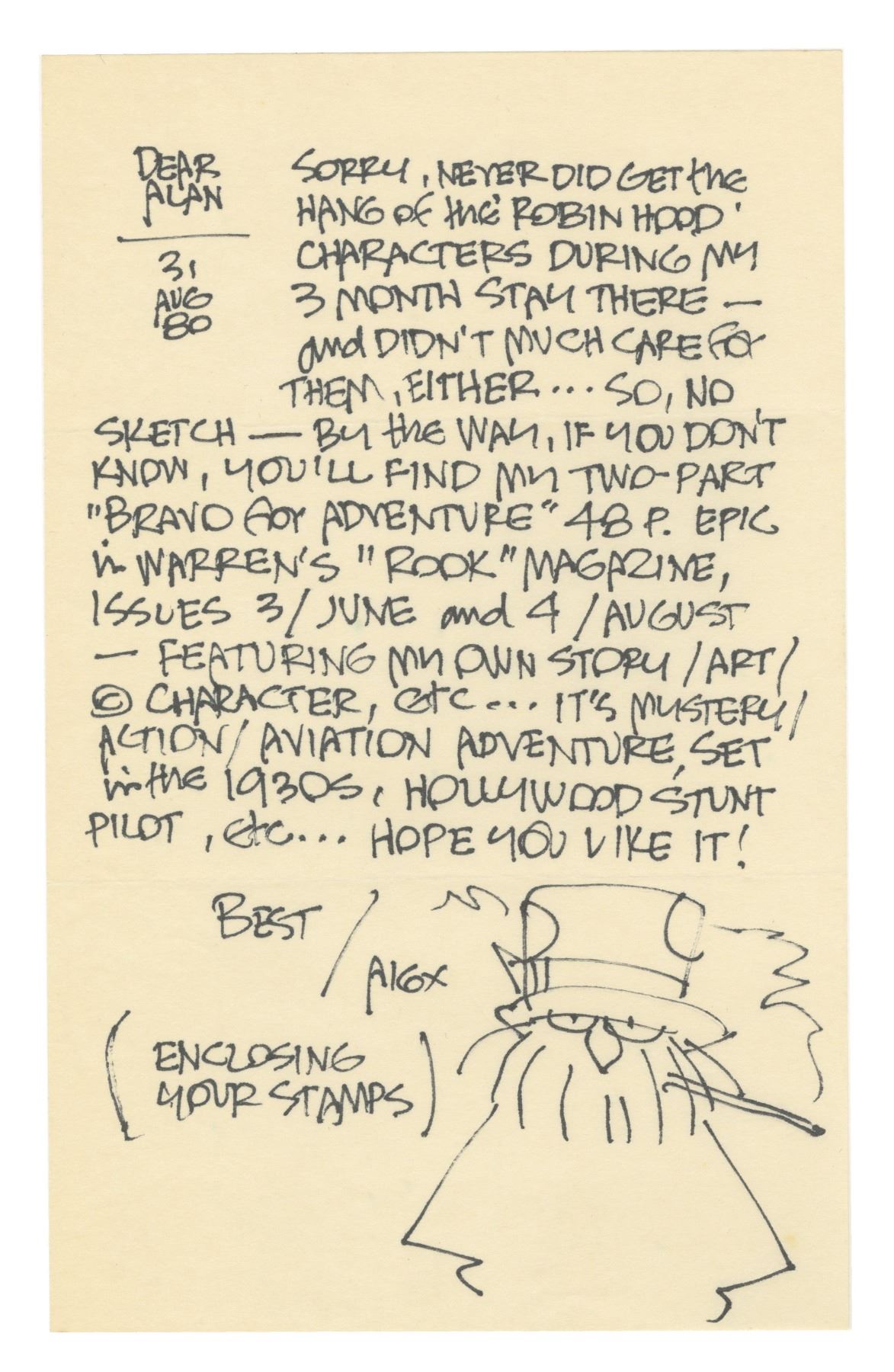 (Toth, 1980) A hand-written letter with sketch by comic book artist, art director, and illustrator Alex Toth. Toth was instrumental in the design of many of Hanna-Barbera’s most famous characters in the 1960s and 1970s, including “The Herculoids”, “Birdman”, and “Space Ghost". The letter is dated Aug 31, 1980. Measuring 8"x5", the letter is in very good condition with faint tri-fold lines from when the letter was originally mailed.