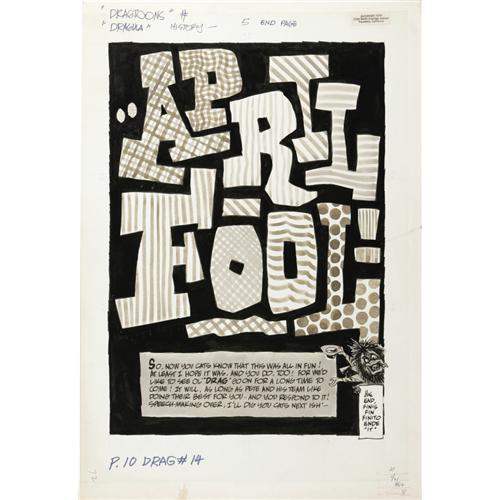 Alex Toth showcases his distinctive letter forms on the final page of "Dragula." Only a master designer could create such a stark effect. This is a prime "effects page" from Toth's way-out, kookie, and revved-up "bigfoot years" -- one of his California custom cool car-toons of the sixties. This "boss" page is drawn on Craftint paper and has an approximate image area of 10" x 14". The art is in Excellent condition.<BR><BR><b>Shipping:</b> Small Flat (<a target="_blank" href="http://www.heritageauctions.com/common/shipping.php">view shipping information</a>)