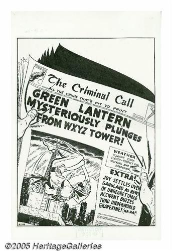 <B>Alex Toth (attributed) - Green Lantern #39 Unpublished Splash Page 1 Original Art (DC, circa 1949).</B></I> The Underworld has its own trade paper and the Golden Age Green Lantern has made front page news in "The Criminal Call." Issue #38 was the last published issue of the original Green Lantern's title; this splash was slated for the never-published #39. Green Lantern was bound, gagged, and thrown from the WXYZ radio tower, but it's certain that the emerald gladiator was somehow able to escape this death trap. Alex Toth made leaps and bounds in developing his skills as a cartoonist while working on the Green Lantern character under the watchful eyes of editor Sheldon Mayer. In the <B>Amazing World of DC Comics</B></I> Toth recalled, "Shelly opened my eyes to the wonders of economy, the bare truth of <I>less is more</B></I>, and helped me see the strength, courage, and the beauty of the unadorned honest line which can stand alone." The image area of the art is 12.5" x 18". Unlike other "written off" pages from DC, this spectacular splash was not cut apart, and is in Excellent condition.