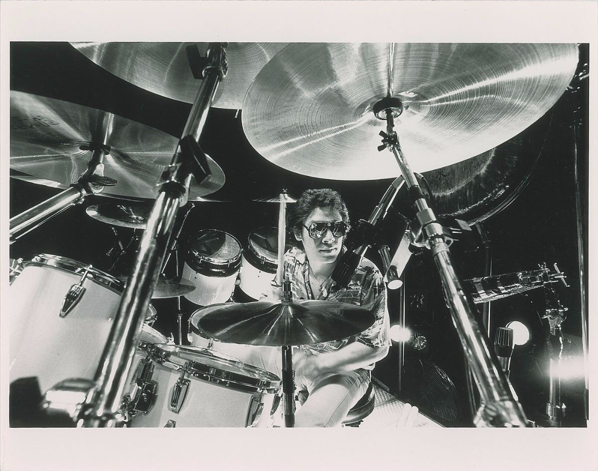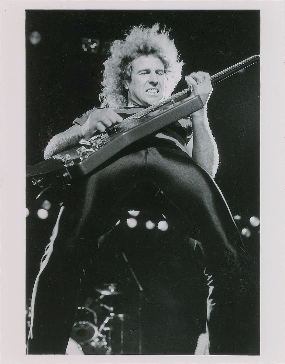 Two original photos by Richard Creamer: a glossy 14 x 11 photo of Alex Van Halen artistically framed by his drum kit; and a satin-finish 11 x 14 photo of Sammy Hagar intensely playing his guitar. In overall fine condition. Provenance: Richard Creamer Estate.