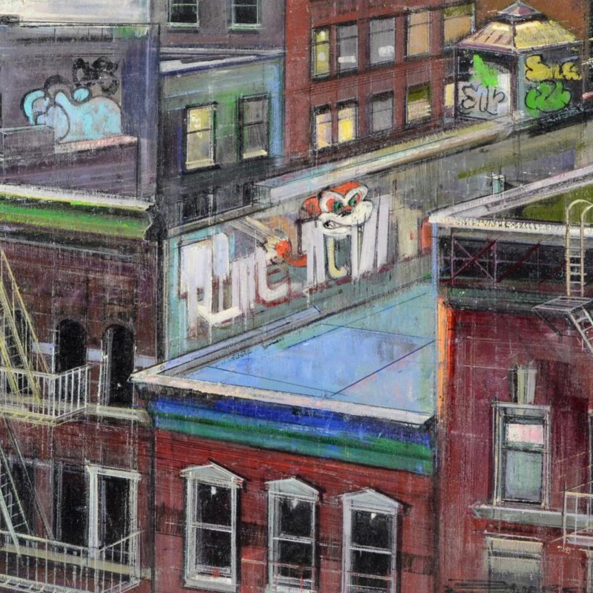 "Rooftop Grafetti" is an original oil painting on stretched canvas by Alex Zwarenstein, titled inverso hand signed by the artist. Includes Certificate of Authenticity. Measures approximately 30" x 24" (image). Reference #: 240117