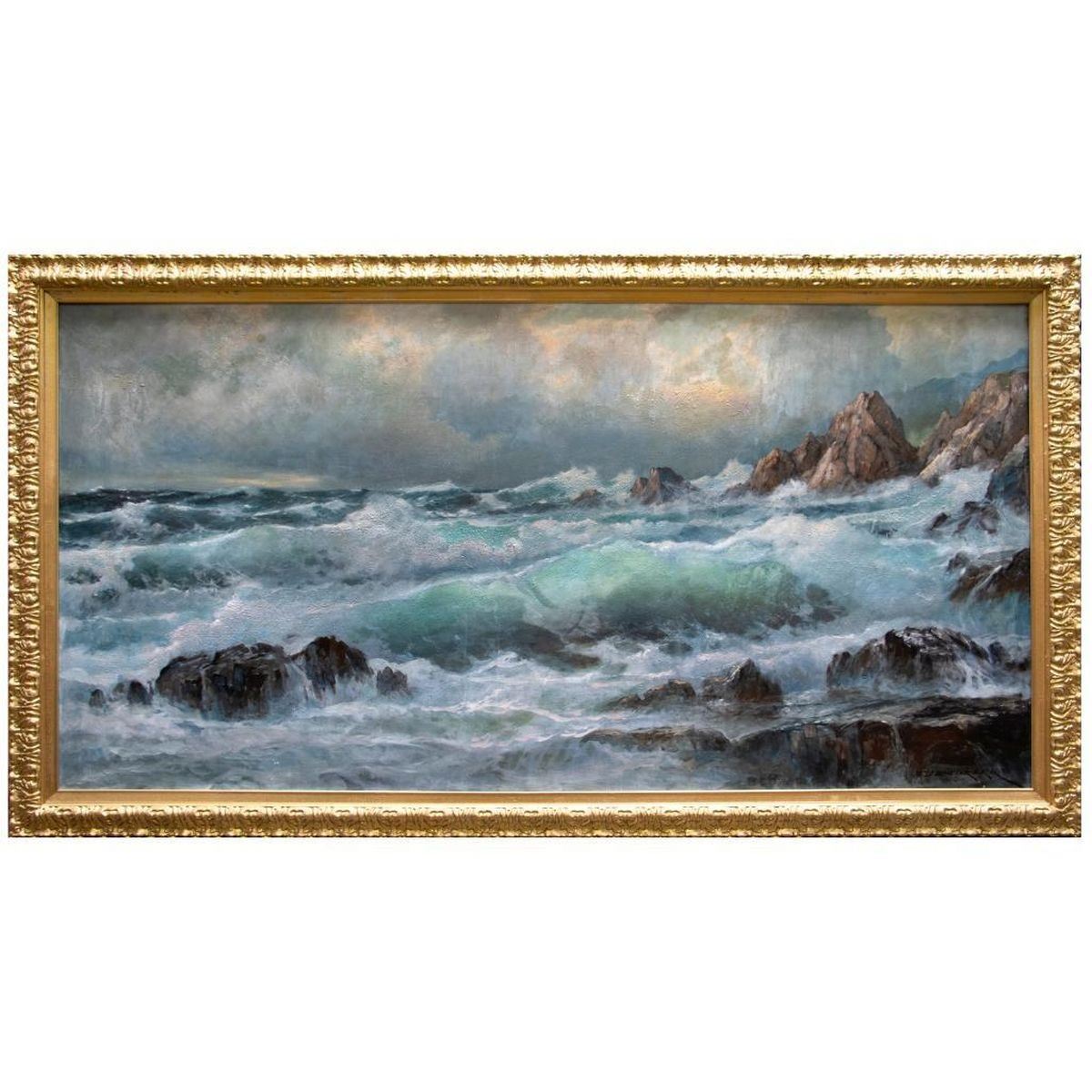 Alexander A. Dzigurski (1911 - 1995). Title: Seascape. Size: 48 x 96 in. Frame Size: 57 x 105 in. Note: Very large item to ship. Condition: somewhat dirty, signs of bubbling to some of the paint surface.