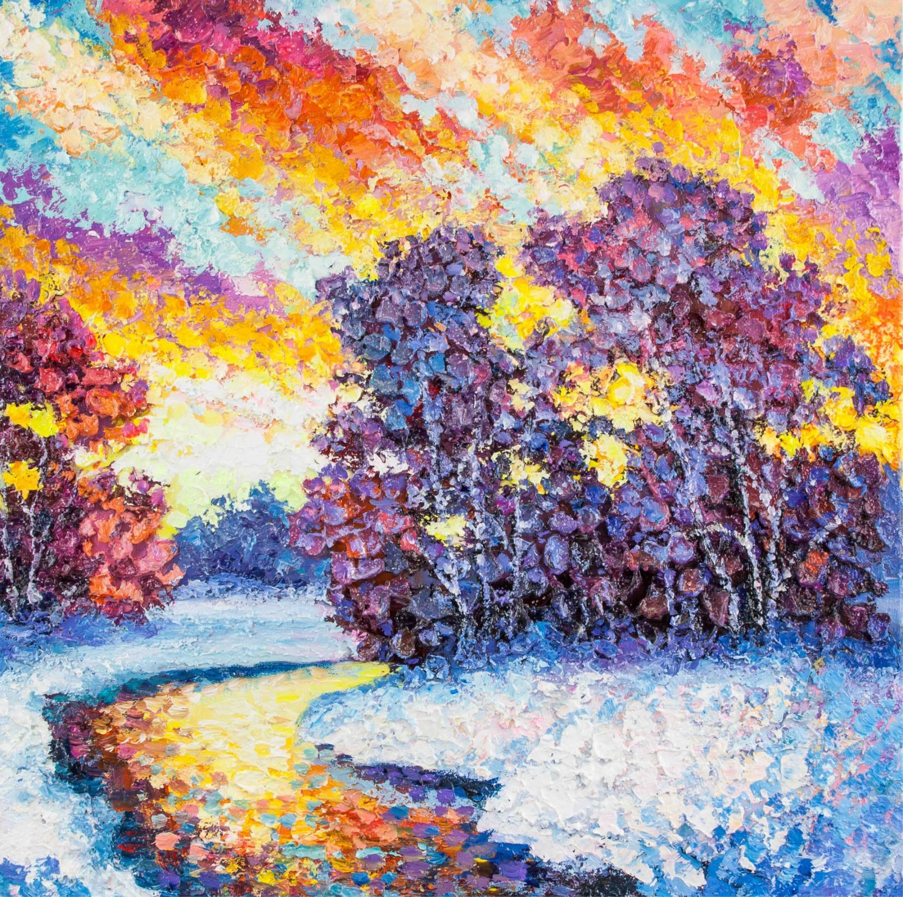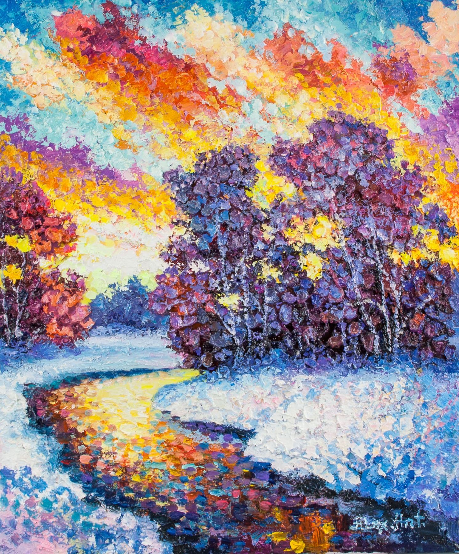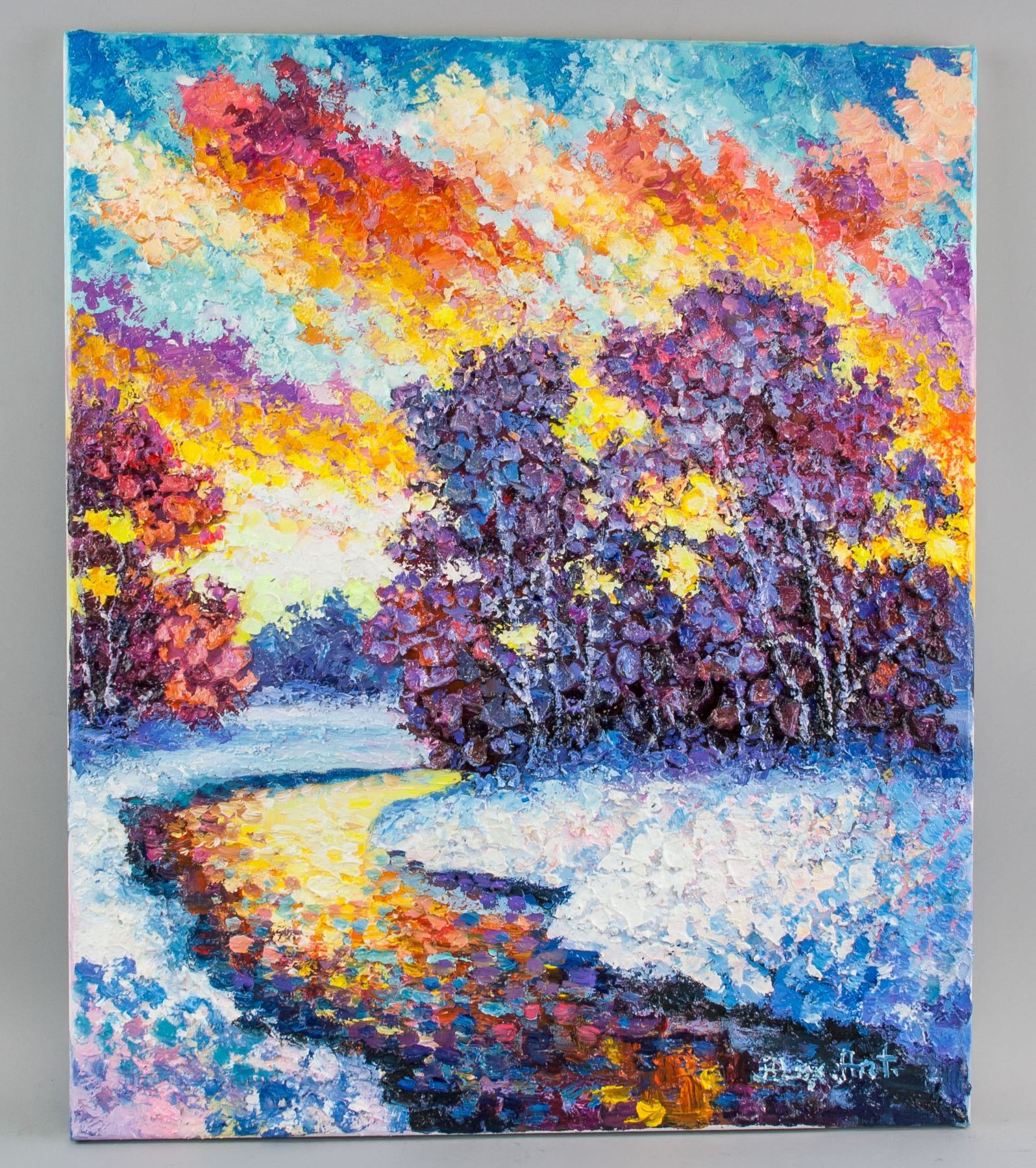 Acrylic on canvas landscape. Signed by Antaneka Alex on lower right corner. Alexander Antanenka was born in Brest, Soviet Union on February 16th, 1951 where he attended art school in grade school, he also attended the Art Academy in Leningrad, Russia and graduated at the top of his class in 1978. Antanenka fled to Siberian City of Maganda after his parents were killed in the Chernobyl disaster, and he was displeased with the Soviet governments attempted to cover up this tragic event. Many artists, poets and politicians who did not believe in their governments practice exiled here. Alexander’s work changed while he resided in the city of Maganda and he was able to express his emotions through his artwork. 24 x 20 inch (61 x 51 cm).