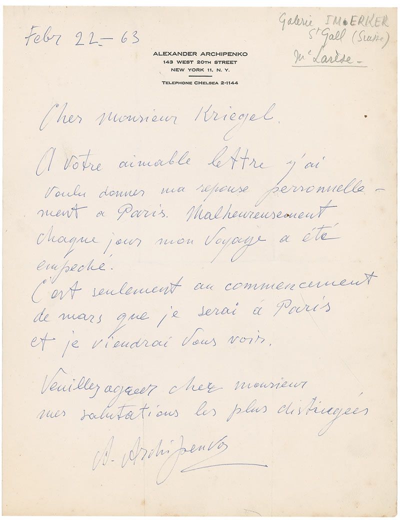 Ukrainian abstract sculpture (1887–1964). Archipenko veered away from the traditional form of neo-classical sculpture to implement the use of negative space to depict the human form, allowing for multiple, simultaneous views of his work. ALS in French signed “A. Archipenko,” one page, 8.5 x 11, personal letterhead, February 22, 1963. Archipenko writes to a gallery owner agreeing to meet him. Intersecting folds, one passing through a single letter of the signature, light creasing, some trivial toning, and a pencil notation to the top right corner, otherwise fine condition.