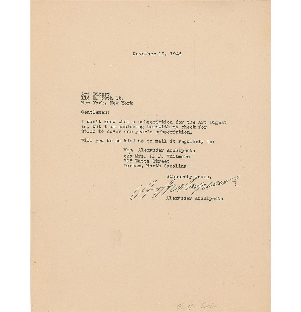 Ukrainian abstract sculptor (1887–1964) who veered away from the traditional form of neo-classical sculpture to implement the use of negative space to depict the human form, allowing for multiple, simultaneous views of his work. TLS signed “A. Archipenko,” one page, 8.5 x 11, November 19, 1946. Letter subscribing to Art Digest, in part: “I don’t know what a subscription for the Art Digest is, but I am enclosing herewith my check for $5.00 to cover one year’s subscription.” In fine condition, with intersecting folds (one vertical fold passing through a single letter of the signature) and some small edge tears. An interesting artistic association, as Art Digest published material about Archipenko on multiple occasions. An example of praise for his work can be found in the July 1937 issue, in which C. J. Bulliet wrote, ‘Archipenko sought and found new aesthetic laws and stylistic innovations that ever conformed to the universal urge for grace and rhythm.’