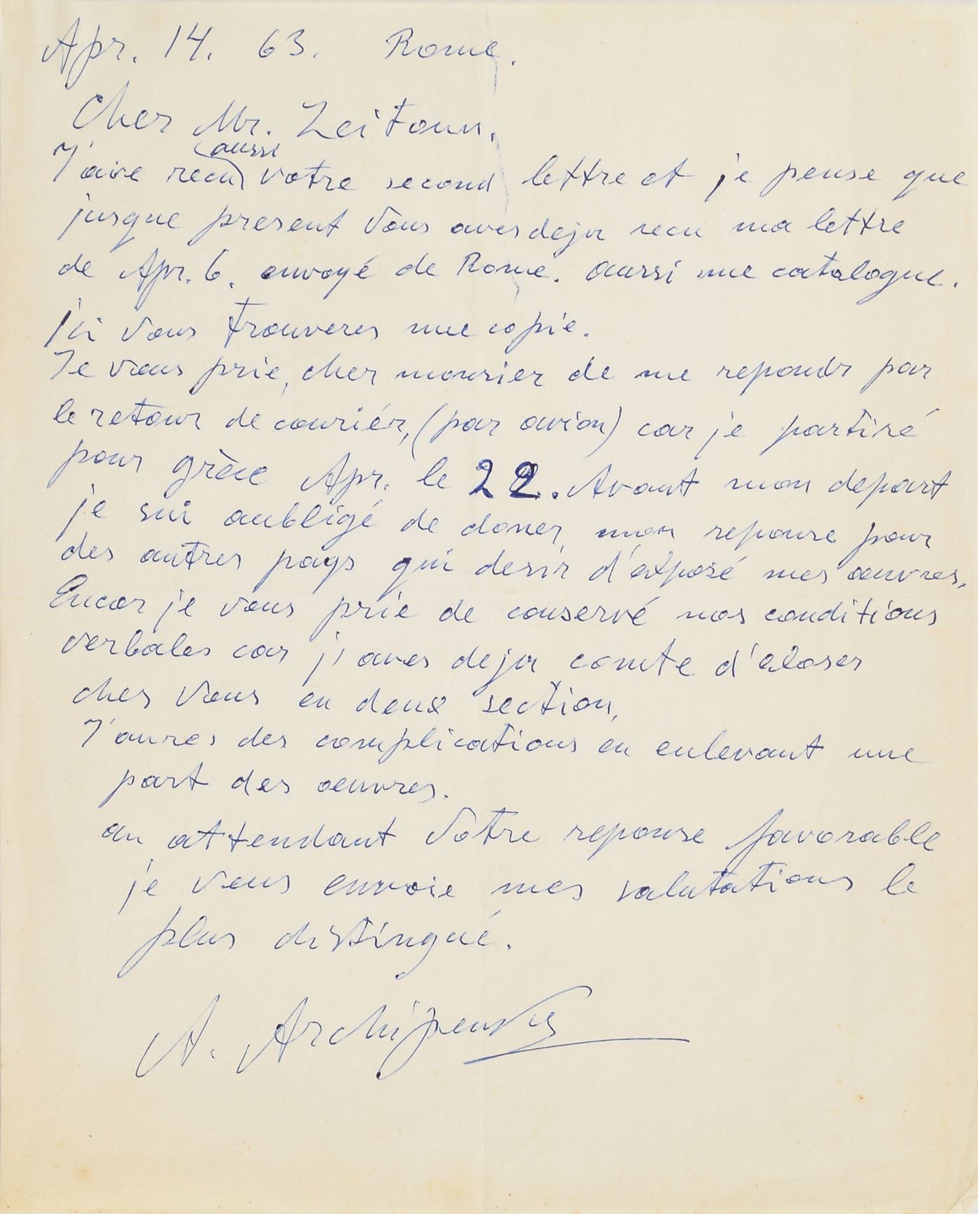 Ukrainian abstract sculptor (1887–1964) who veered away from the traditional form of neo-classical sculpture to implement the use of negative space to depict the human form, allowing for multiple, simultaneous views of his work. Untranslated ALS in French, signed “A. Archipenko,” one page, 8.75 x 11, April 14, 1963. In fine condition.