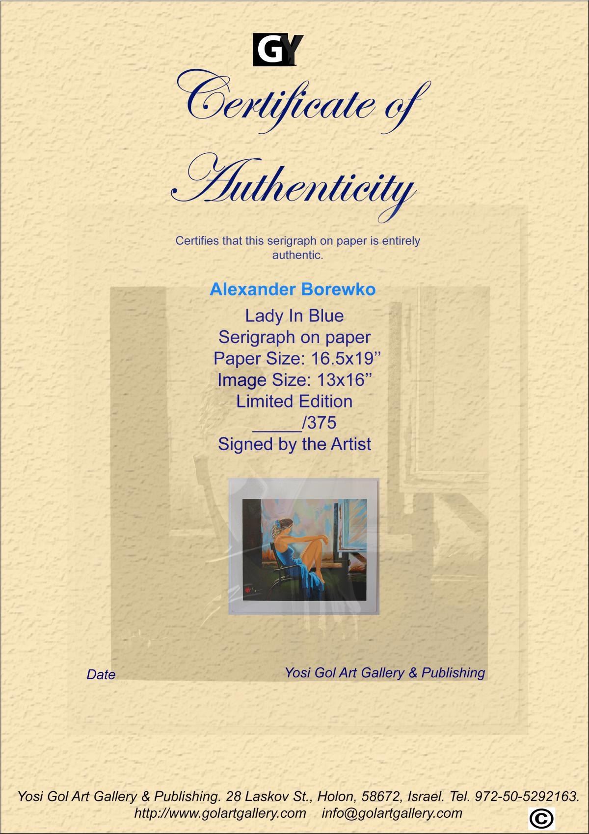 Artist: Alexander Borewko. Medium: Original Serigraph on Paper. Title: Lady In Blue. Size (Unframed): 16.5" x 19". Limited Edition: Edition of 375. Certificate of Authenticity: From the publisher. Reference# 200069.