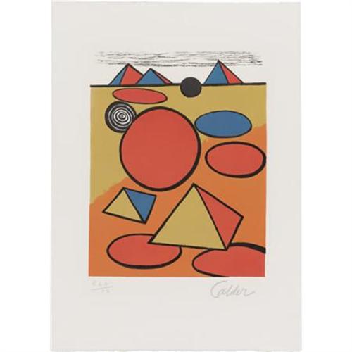 <B>ALEXANDER CALDER (American, 1898-1976)</B></I><BR><I>Pyramids</B></I><BR>Color lithograph<BR>12 x 9-1/2 inches (30.5 x 24.1 cm)<BR>Ed. 152/200<BR>Signed in pencil lower right: <I>Calder</B></I><BR>Inscribed in pencil verso: <I>Cal 15 Homage to the Pyramids 21131</B></I><BR> <B>Condition Report:</B> Good condition.<BR><BR><b>Shipping:</b> Flat Material, Small (<a target="_blank" href="http://www.heritageauctions.com/common/shipping.php">view shipping information</a>)