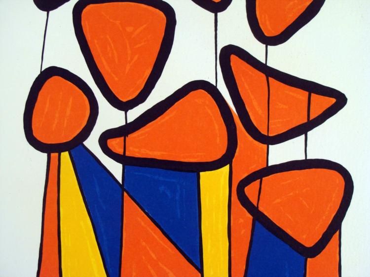 This colorful work is a Calder fine art print on paper with tan border, ready to framed as is.Artist: Alexander CalderMedium: Lithograph on paperSheet size: 14 x 20 1/2 inches Image size: 9 x 12 1/4 inchesCondition: Excellent