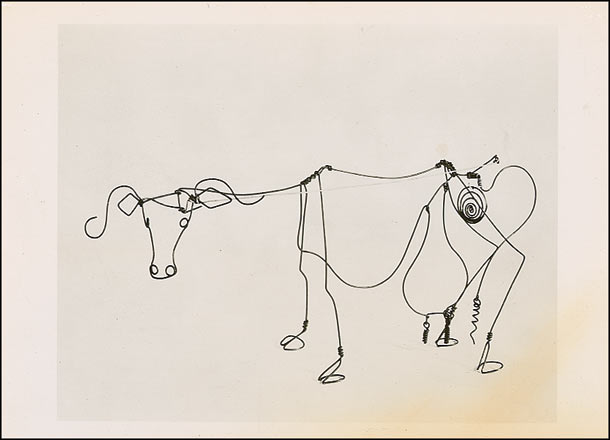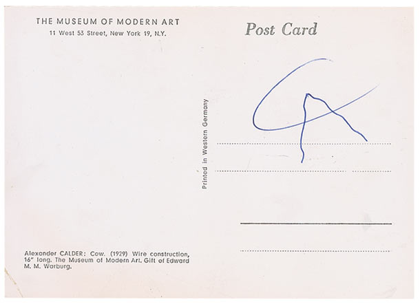 Ballpoint signature on the reverse of an 5.75 x 4 postcard featuring Calder’s piece, ‘Cow.’ In fine condition, with light corner creasing, heavier to the bottom right corner, and moderate toning to the same corner.