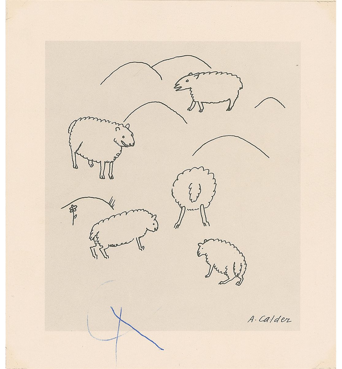 Blank greeting card featuring Calder’s 1955 ‘Sheep’ work on the front, signed on the front in blue ballpoint, “AC.” In fine condition, with a bit of trivial corner tip soiling.